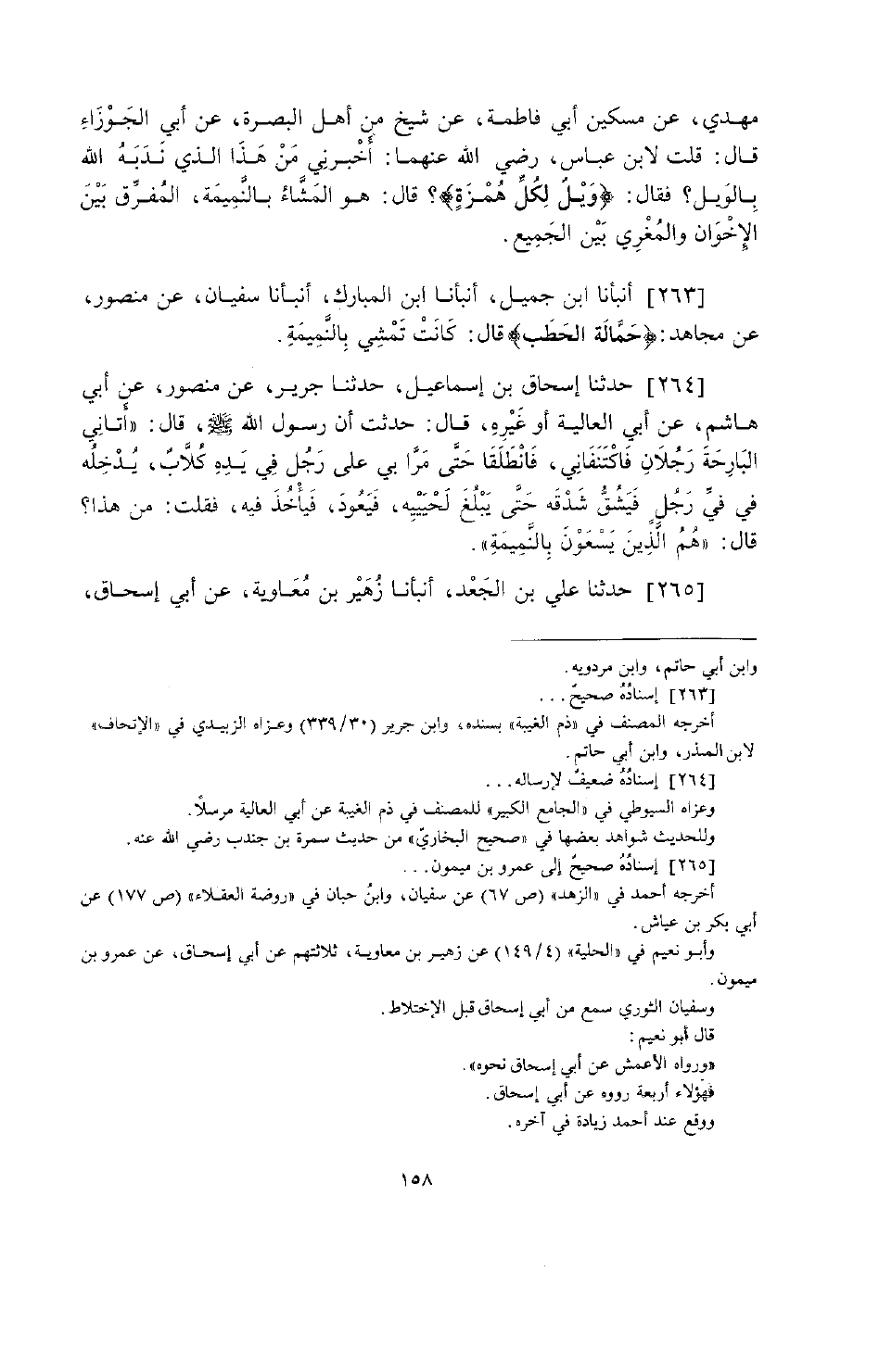 263 - أَخْبَرَنَا ابْنُ جَمِيلٍ، أَخْبَرَنَا ابْنُ الْمُبَارَكِ، أَخْبَرَنَا سُفْيَانُ، عَنْ مَنْصُورٍ، عَنْ مُجَاهِدٍ: {حَمَالَةَ الْحَطَبِ} [المسد: 4] قَالَ: «§كَانَتْ تَمْشِي بِالنَّمِيمَةِ»