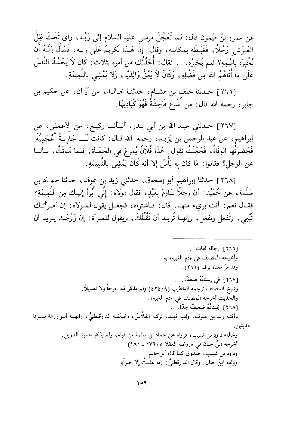 268 - حَدَّثَنَا إِبْرَاهِيمُ أَبُو إِسْحَاقَ، حَدَّثَنِي زَيْدُ بْنُ عَوْفٍ، حَدَّثَنَا حَمَّادُ بْنُ سَلَمَةَ، عَنْ حُمَيْدٍ: " أَنَّ §رَجُلًا سَاوَمَ بِعَبْدٍ، فَقَالَ مَوْلَاهُ: إِنِّي أَبْرَأُ إِلَيْكَ مِنَ النَّمِيمَةِ، فَقَالَ: نَعَمْ، أَنْتَ بَرِيءٌ مِنْهَا، قَالَ: فَاشْتَرَاهُ، فَجَعَلَ يَقُولُ لِمَوْلَاهُ: إِنَّ امْرَأَتَكَ تَبْغِي وَتَفْعَلُ وَتَفْعَلُ، وَإِنَّهَا تُرِيدُ أَنْ تَقْتُلَكَ، وَيَقُولُ لِلْمَرْأَةِ: إِنَّ زَوْجَكِ يُرِيدُ أَنْ -[160]- يَتَزَوَّجَ عَلَيْكِ، وَيَتَسَرَّى عَلَيْكِ، فَإِنْ أَرَدْتِ أَنْ أَعْطِفَهُ عَلَيْكِ فَلَا يَتَزَوَّجَ عَلَيْكِ، وَلَا يَتَسَرَّى، فَخُذِي الْمُوسَى فَاحْلِقِي شَعْرَةً مِنْ حَلْقِهِ إِذَا نَامَ، وَقَالَ لِلزَّوْجِ: إِنَّهَا تُرِيدُ أَنْ تَقْتُلَكَ إِذَا نِمْتَ، قَالَ: فَذَهَبَ فَتَنَاوَمَ لَهَا، وَجَاءَتْ بِمُوسَى لِتَحْلِقَ شَعْرَةً مِنْ حَلْقِهِ، فَأَخَذَ بِيَدِهَا فَقَتَلَهَا، فَجَاءَ أَهْلُهَا، فَاسْتَعْدَوْا، فَقَتَلُوهُ "