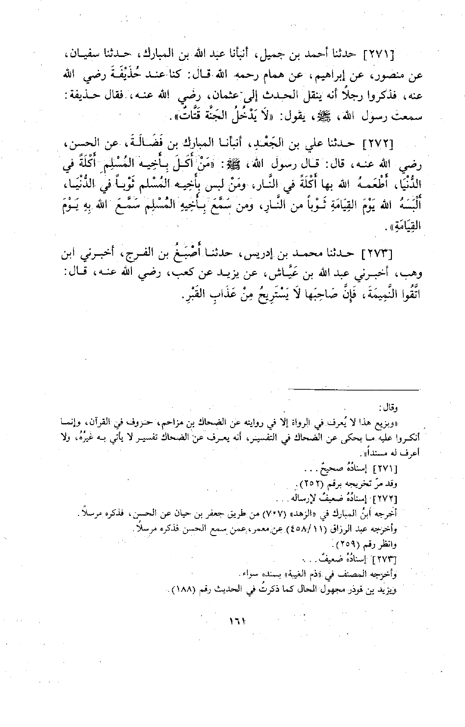 271 - حَدَّثَنَا أَحْمَدُ بْنُ جَمِيلٍ، أَخْبَرَنَا عَبْدُ اللَّهِ بْنُ الْمُبَارَكِ، حَدَّثَنَا سُفْيَانُ، عَنْ مَنْصُورٍ، عَنْ إِبْرَاهِيمَ، عَنْ هَمَّامٍ رَحِمَهُ اللَّهُ، قَالَ: كُنَّا عِنْدَ حُذَيْفَةَ رَضِيَ اللَّهُ عَنْهُ، فَذَكَرُوا رَجُلًا أَنَّهُ يَنْقُلُ الْحَدِيثَ إِلَى عُثْمَانَ رَضِيَ اللَّهُ عَنْهُ، فَقَالَ حُذَيْفَةُ: سَمِعْتُ رَسُولَ اللَّهِ صَلَّى اللهُ عَلَيْهِ وَسَلَّمَ يَقُولُ: «§لَا يَدْخُلُ الْجَنَّةَ قَتَّاتٌ»