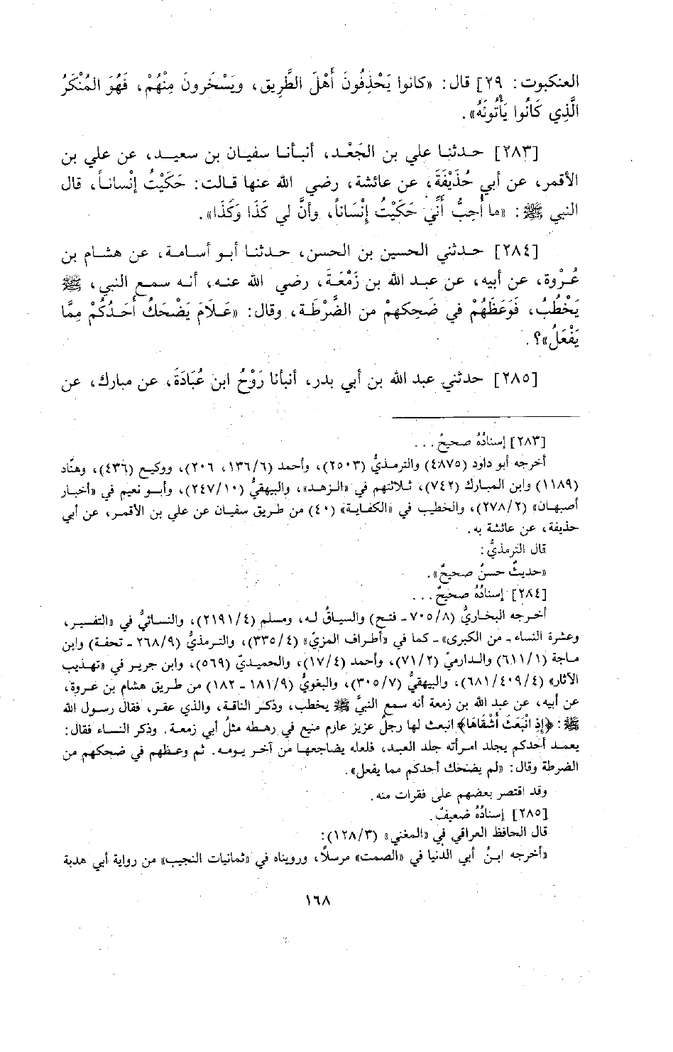 284 - حَدَّثَنِي الْحُسَيْنُ بْنُ الْجُنِيدِ، حَدَّثَنَا أَبُو أُسَامَةَ، عَنْ هِشَامِ بْنِ عُرْوَةَ، عَنْ أَبِيهِ، عَنْ عَبْدِ اللَّهِ بْنِ زَمْعَةَ رَضِيَ اللَّهُ عَنْهُ، أَنَّهُ سَمِعَ النَّبِيَّ صَلَّى اللهُ عَلَيْهِ وَسَلَّمَ يَخْطُبُ، §فَوَعَظَهُمْ فِي ضَحِكِهِمْ مِنَ الضَّرْطَةِ، وَقَالَ: «عَلَامَ يَضْحَكُ أَحَدُكُمْ مِمَّا يَفْعَلُ؟»