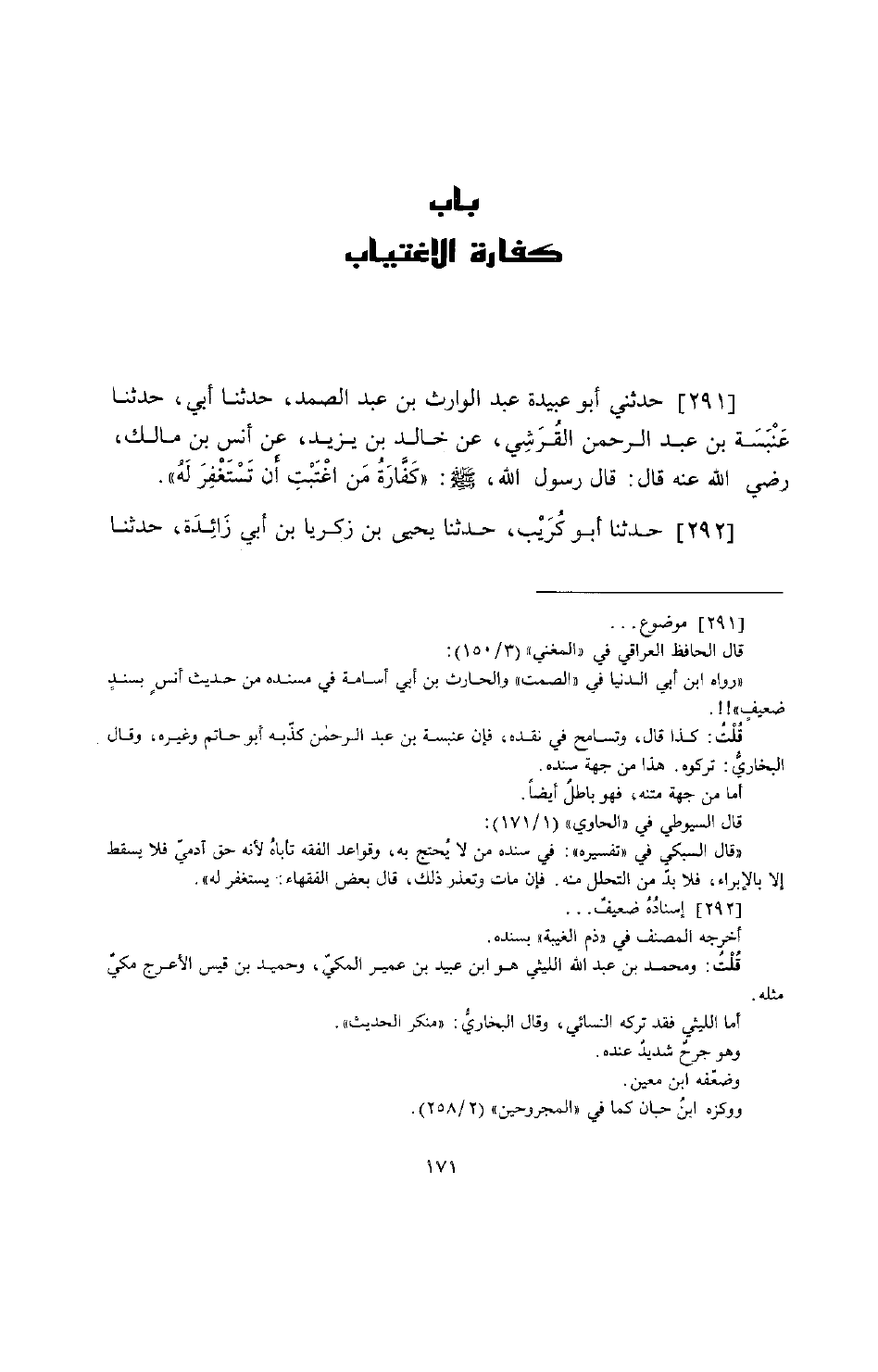 حَدَّثَنِي أَبُو عُبَيْدَةَ عَبْدُ الْوَارِثِ بْنُ عَبْدِ الصَّمَدِ، حَدَّثَنَا أَبِي، حَدَّثَنَا عَنْبَسَةُ بْنُ عَبْدِ الرَّحْمَنِ الْقُرَشِيُّ، عَنْ خَالِدِ بْنِ يَزِيدَ، عَنْ أَنَسِ بْنِ مَالِكٍ رَضِيَ اللَّهُ عَنْهُ قَالَ: قَالَ رَسُولُ اللَّهِ صَلَّى اللهُ عَلَيْهِ وَسَلَّمَ: «§كَفَّارَةُ مَنِ اغْتَبْتَ أَنْ تَسْتَغْفِرَ لَهُ»