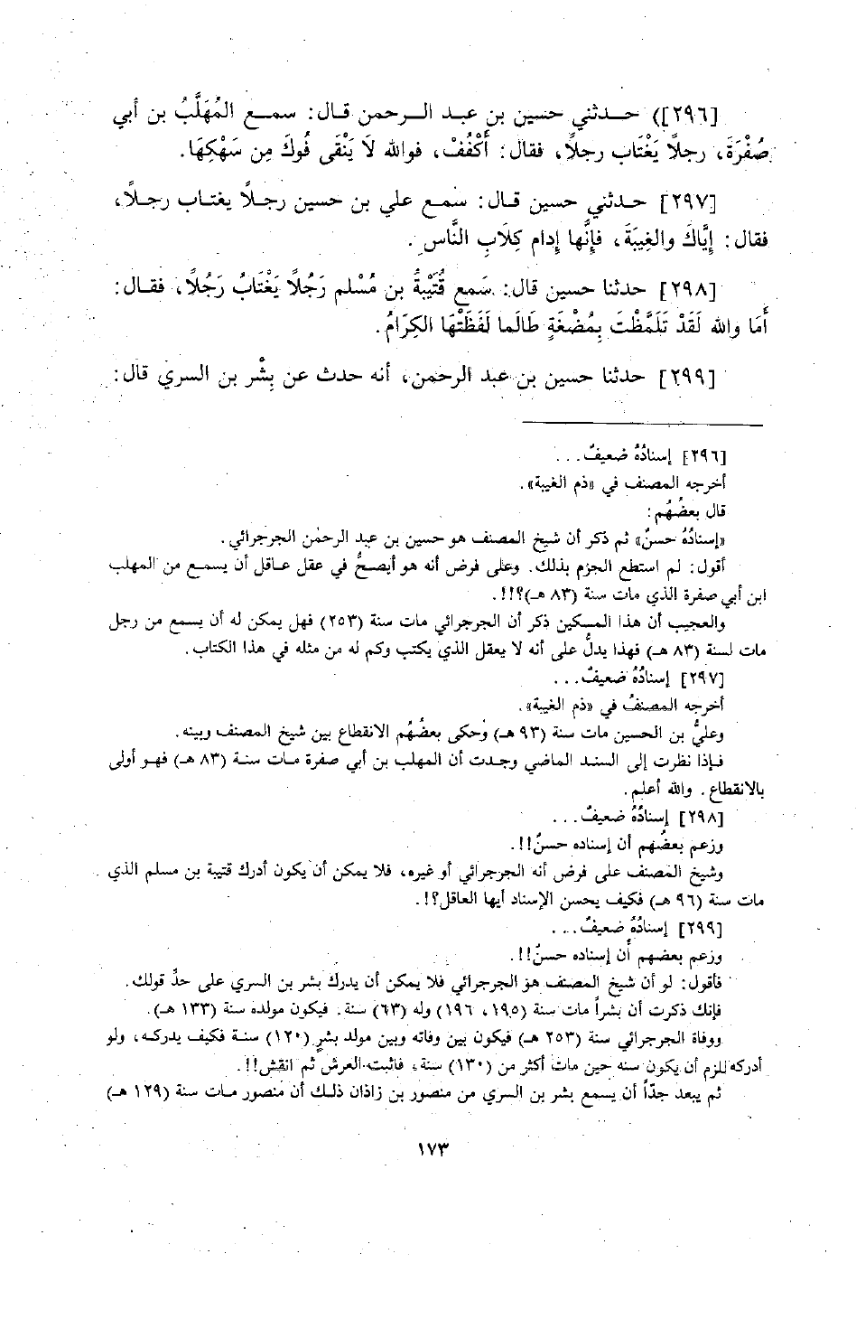 299 - حَدَّثَنَا حُسَيْنُ بْنُ عَبْدِ الرَّحْمَنِ: أَنَّهُ حَدَّثَ عَنْ بِشْرِ بْنِ السَّرِيِّ، قَالَ -[174]-: قَالَ مَنْصُورُ بْنُ زَاذَانَ، رَحِمَهُ اللَّهُ: «إِنَّ §الرَّجُلَ مِنْ إِخْوَانِي يَلْقَانِي فَأَفْرَحُ، إِنْ لَمْ يَسُؤْنِي فِي صَدِيقِي وَيُبَلِّغُنِي الْغِيبَةَ مِمَّنِ اغْتَابَنِي، وَإِنِّي لَفِي جَهْدٍ مِنْ جَلِيسِي حَتَّى يُفَارِقَنِي مَخَافَةَ أَنْ يَأْثَمَ وَيُؤَثِّمَنِي»