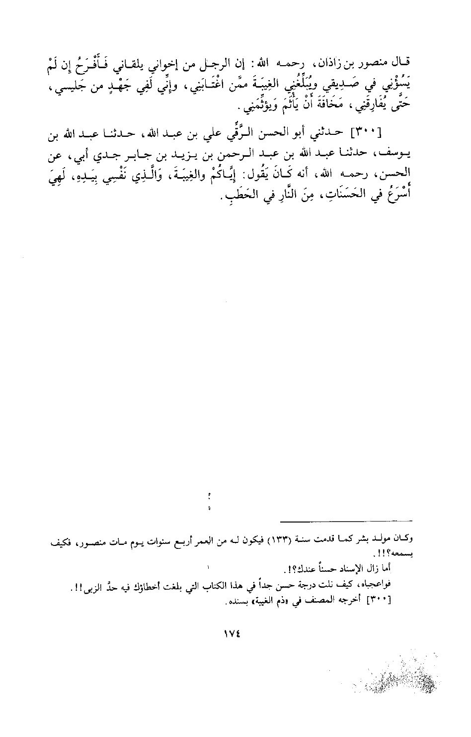 300 - حَدَّثَنِي أَبُو الْحَسَنِ الرَّقِّيُّ عَلِيُّ بْنُ عَبْدِ اللَّهِ، حَدَّثَنَا عَبْدُ اللَّهِ بْنُ يُوسُفَ، حَدَّثَنَا عَبْدُ اللَّهِ بْنُ عَبْدِ الرَّحْمَنِ بْنِ يَزِيدَ بْنِ جَابِرٍ، حَدَّثَنِي أَبِي، عَنِ الْحَسَنِ رَحِمَهُ اللَّهُ، أَنَّهُ كَانَ يَقُولُ: «§إِيَّاكُمْ وَالْغِيبَةَ، وَالَّذِي نَفْسِي بِيَدِهِ لَهِيَ أَسْرَعُ فِي الْحَسَنَاتِ مِنَ النَّارِ فِي الْحَطَبِ»