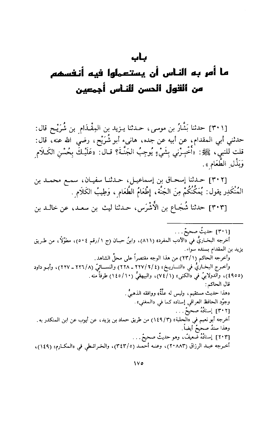301 - حَدَّثَنَا بَشَّارُ بْنُ مُوسَى الْخَفَّافُ، حَدَّثَنَا يَزِيدُ بْنُ الْمِقْدَامِ بْنِ شُرَيْحٍ، قَالَ: حَدَّثَنِي أَبِي الْمِقْدَامُ، عَنْ أَبِيهِ، عَنْ جَدِّهِ هَانِئٍ أَبُو شُرَيْحٍ رَضِيَ اللَّهُ عَنْهُ قَالَ: قُلْتُ لِلنَّبِيِّ صَلَّى اللهُ عَلَيْهِ وَسَلَّمَ: أَخْبِرْنِي بِشَيْءٍ يُوجِبُ الْجَنَّةَ. قَالَ: «§عَلَيْكَ بِحُسْنِ الْكَلَامِ، وَبَذْلِ الطَّعَامِ»