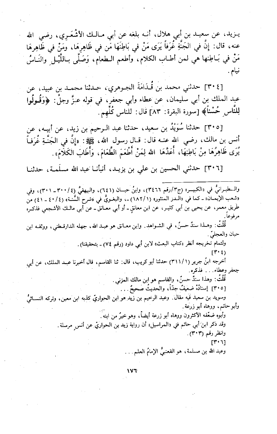 305 - حَدَّثَنَا سُوَيْدُ بْنُ سَعِيدٍ، حَدَّثَنَا عَبْدُ الرَّحِيمِ بْنُ زَيْدٍ، عَنْ أَبِيهِ، عَنْ أَنَسِ بْنِ مَالِكٍ رَضِيَ اللَّهُ عَنْهُ قَالَ: قَالَ رَسُولُ اللَّهِ صَلَّى اللهُ عَلَيْهِ وَسَلَّمَ: «إِنَّ §فِي الْجَنَّةِ غُرَفًا يُرَى ظَاهِرُهَا مِنْ بَاطِنِهَا أَعَدَّهَا اللَّهُ لِمَنْ أَطْعَمَ الطَّعَامَ، وَأَطَابَ الْكَلَامَ»