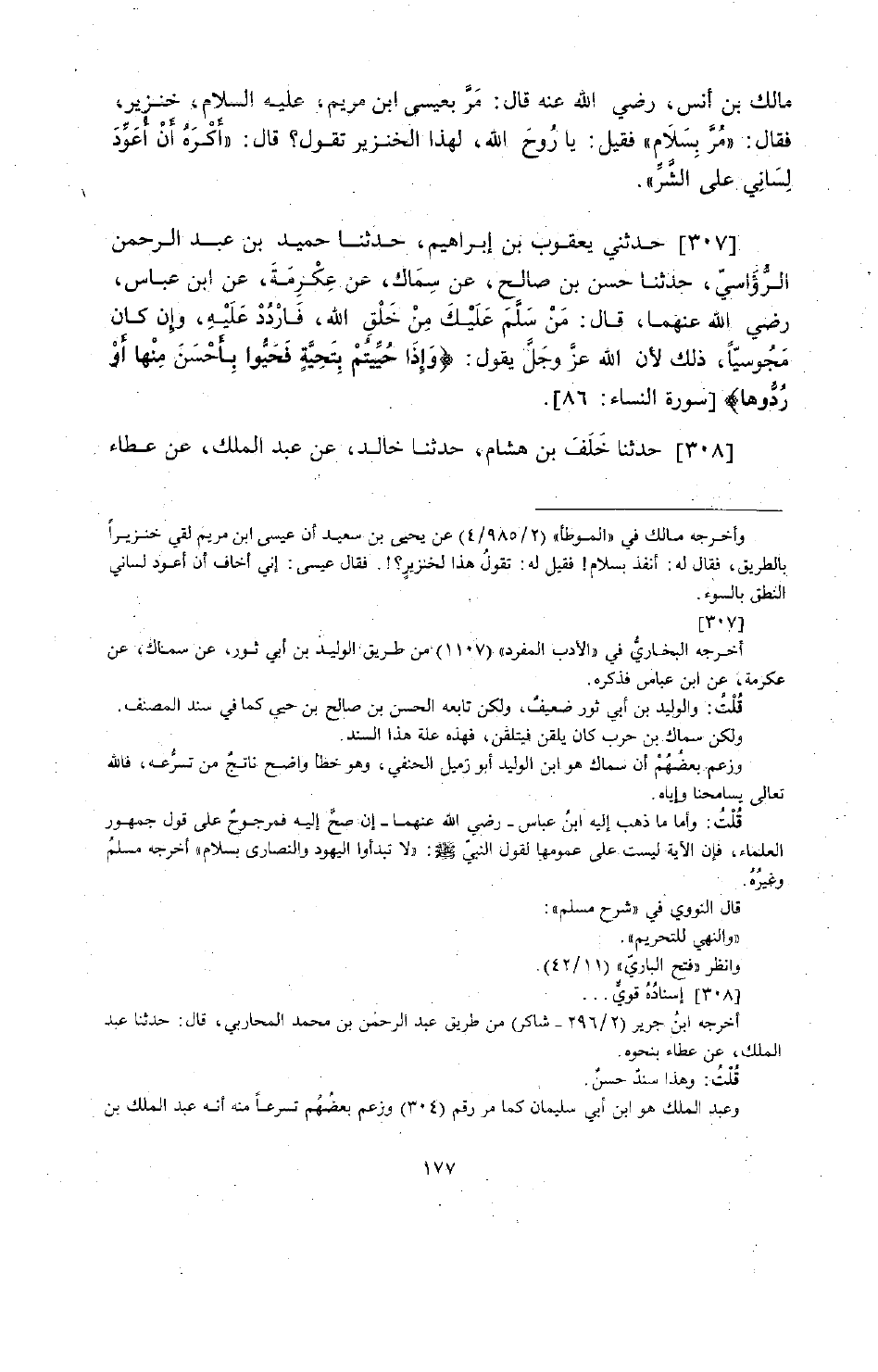 307 - حَدَّثَنِي يَعْقُوبُ بْنُ إِبْرَاهِيمَ، حَدَّثَنَا حُمَيْدُ بْنُ عَبْدِ الرَّحْمَنِ الرُّؤَاسِيُّ، حَدَّثَنَا حَسَنُ بْنُ صَالِحٍ، عَنْ سِمَاكٍ، عَنْ عِكْرِمَةَ، عَنِ ابْنِ عَبَّاسٍ رَضِيَ اللَّهُ عَنْهُمَا قَالَ: " §مَنْ سَلَّمَ عَلَيْكَ مِنْ خَلْقِ اللَّهِ فَارْدُدْ عَلَيْهِ، وَإِنْ كَانَ مَجُوسِيًّا، ذَلِكَ؛ لِأَنَّ اللَّهَ عَزَّ وَجَلَّ يَقُولُ: {وَإِذَا حُيِّيتُمْ بِتَحِيَّةٍ فَحَيُّوا بِأَحْسَنَ مِنْهَا أَوْ رُدُّوهَا} [النساء: 86] "