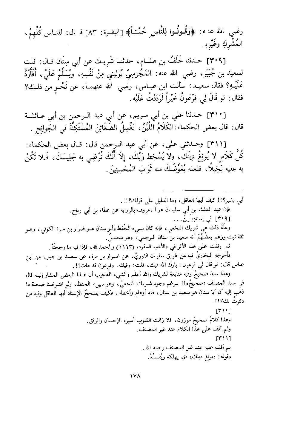 309 - حَدَّثَنَا خَلَفُ بْنُ هِشَامٍ، حَدَّثَنَا شَرِيكٌ، عَنْ أَبِي سِنَانٍ، قَالَ: قُلْتُ لِسَعِيدِ بْنِ جُبَيْرٍ رَضِيَ اللَّهُ عَنْهُ: الْمَجُوسِيُّ يُولِينِي مِنْ نَفْسِهِ، وَيُسَلِّمُ عَلَيَّ، أَفَأَرُدُّ عَلَيْهِ؟ فَقَالَ سَعِيدٌ: سَأَلْتُ ابْنَ عَبَّاسٍ رَضِيَ اللَّهُ عَنْهُمَا عَنْ نَحْوٍ مِنْ ذَلِكَ فَقَالَ: «§لَوْ قَالَ لِي فِرْعَوْنُ خَيْرًا لَرَدَدْتُ عَلَيْهِ»