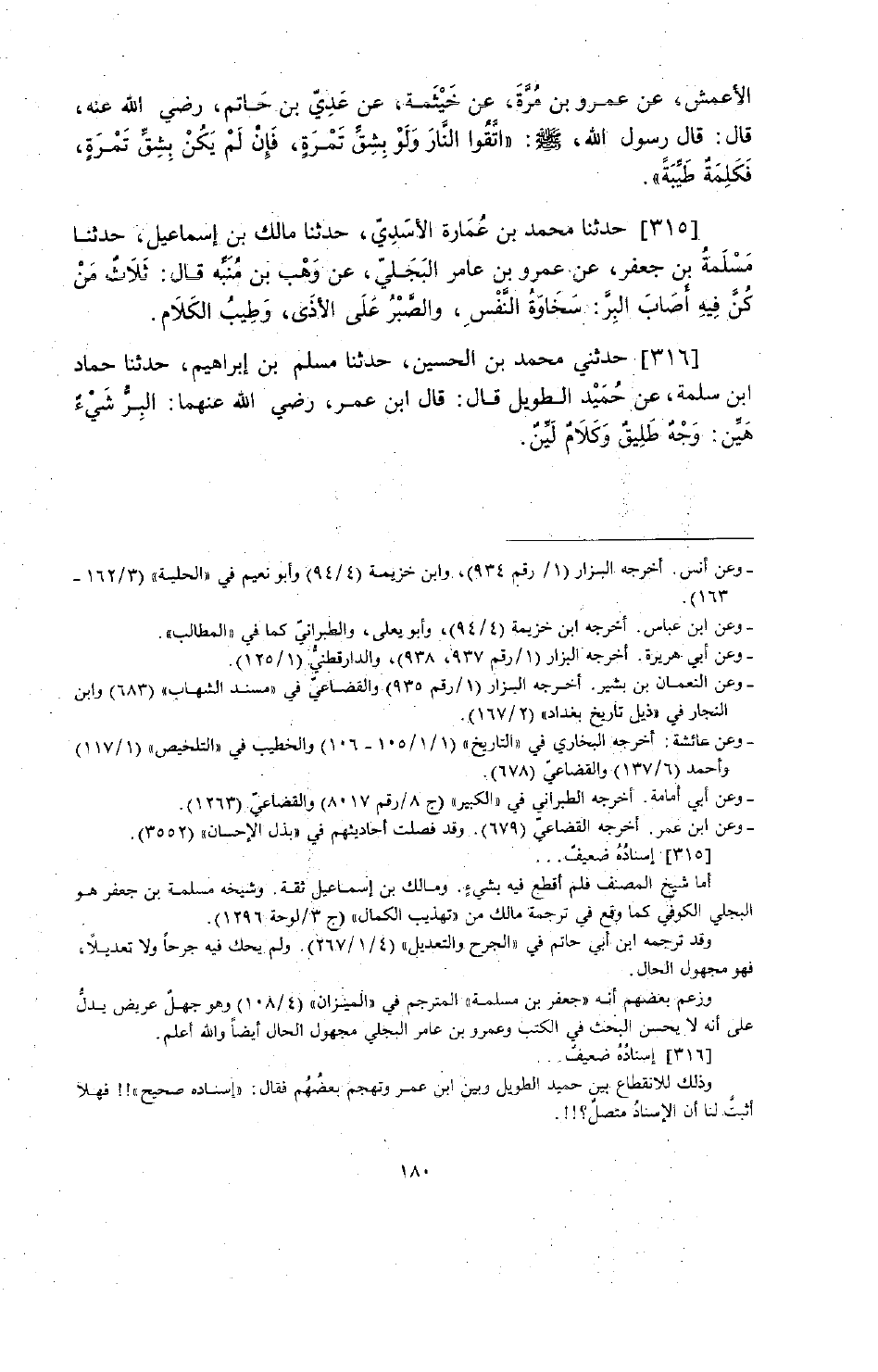 316 - حَدَّثَنِي مُحَمَّدُ بْنُ الْحُسَيْنِ، حَدَّثَنَا مُسْلِمُ بْنُ إِبْرَاهِيمَ، حَدَّثَنَا حَمَّادُ بْنُ سَلَمَةَ، عَنْ حُمَيْدٍ الطَّوِيلِ قَالَ: قَالَ ابْنُ عُمَرَ رَضِيَ اللَّهُ عَنْهُمَا: " §الْبِرُّ شَيْءٌ هَيِّنٌ: وَجْهٌ طَلِيقٌ وَكَلَامٌ لَيِّنٌ "