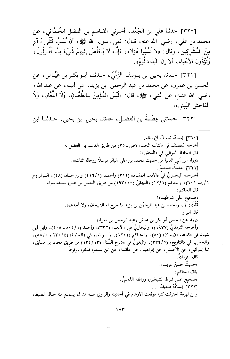 320 - حَدَّثَنَا عَلِيُّ بْنُ الْجَعْدِ، أَخْبَرَنِي الْقَاسِمُ بْنُ الْفَضْلِ الْحُدَّانِيُّ، عَنْ مُحَمَّدِ بْنِ عَلِيٍّ رَضِيَ اللَّهُ عَنْهُ قَالَ: نَهَى رَسُولُ اللَّهِ صَلَّى اللهُ عَلَيْهِ وَسَلَّمَ أَنْ يُسَبَّ قَتْلَى بَدْرٍ مِنَ الْمُشْرِكِينَ وَقَالَ: «§لَا تَسُبُّوا هَؤُلَاءِ، فَإِنَّهُ لَا يَخْلُصُ إِلَيْهِمْ شَيْءٌ مِمَّا تَقُولُونَ وَتُؤْذُونَ الْأَحْيَاءَ، أَلَا إِنَّ الْبَذَاءَ لُؤْمٌ»
