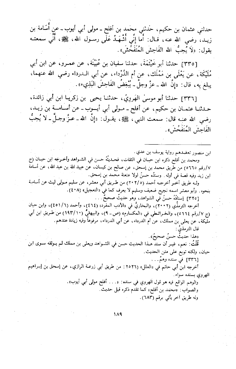 336 - حَدَّثَنَا أَبُو مُوسَى الْهَرَوِيُّ، حَدَّثَنَا يَحْيَى بْنُ زَكَرِيَّا بْنِ أَبِي زَائِدَةَ، حَدَّثَنَا عُثْمَانُ بْنُ حَكِيمٍ، عَنْ أَفْلَحَ، مَوْلَى أَبِي أَيُّوبَ، عَنْ أُسَامَةَ بْنِ زَيْدٍ رَضِيَ اللَّهُ عَنْهُ قَالَ: سَمِعْتُ النَّبِيَّ صَلَّى اللهُ عَلَيْهِ وَسَلَّمَ يَقُولُ: «إِنَّ §اللَّهَ عَزَّ وَجَلَّ لَا يُحِبُّ الْفَاحِشَ الْمُتَفَحِّشَ»