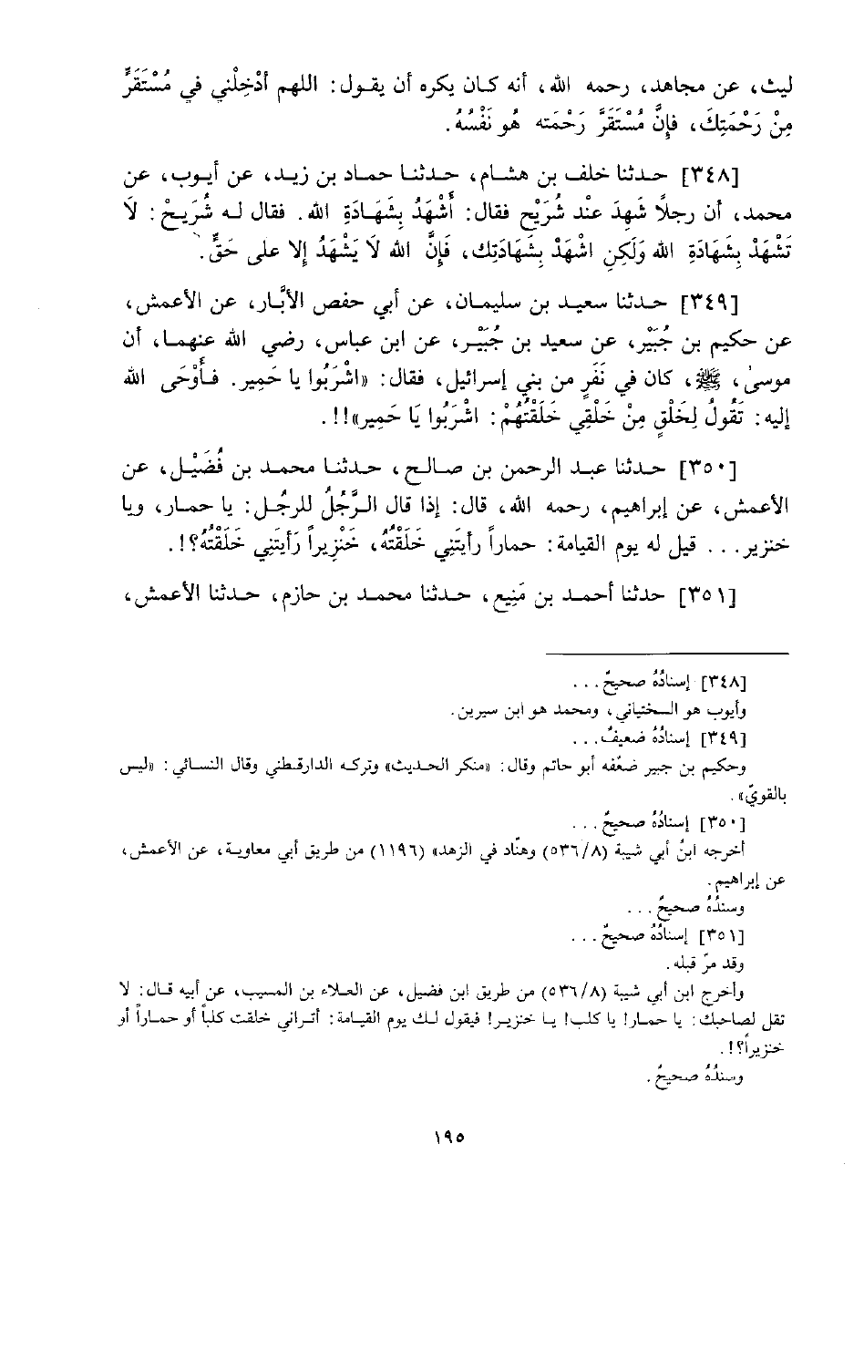 351 - حَدَّثَنَا أَحْمَدُ بْنُ مَنِيعٍ، حَدَّثَنَا مُحَمَّدُ بْنُ خَازِمٍ، حَدَّثَنَا الْأَعْمَشُ، عَنْ إِبْرَاهِيمَ رَحِمَهُ اللَّهُ، قَالَ: " §إِذَا قَالَ الرَّجُلُ لِأَخِيهِ: يَا خِنْزِيرُ. قَالَ اللَّهُ لَهُ يَوْمَ الْقِيَامَةِ: تَرَانِي خَلَقْتُهُ خِنْزِيرًا؟ "