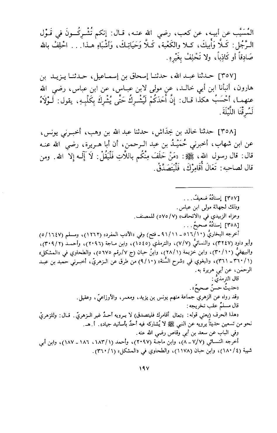 358 - حَدَّثَنَا خَالِدُ بْنُ خِدَاشٍ، حَدَّثَنَا عَبْدُ اللَّهِ بْنُ وَهْبٍ، أَخْبَرَنِي يُونُسُ، عَنِ ابْنِ شِهَابٍ، أَخْبَرَنِي حُمَيْدُ بْنُ عَبْدِ الرَّحْمَنِ: أَنَّ أَبَا هُرَيْرَةَ رَضِيَ اللَّهُ عَنْهُ قَالَ: قَالَ رَسُولُ اللَّهِ صَلَّى اللهُ عَلَيْهِ وَسَلَّمَ: " §مَنْ حَلَفَ مِنْكُمْ بِاللَّاتِ فَلْيَقُلْ: لَا إِلَهَ إِلَّا اللَّهُ، وَمَنْ قَالَ لِصَاحِبِهِ: تَعَالَ أُقَامِرْكَ فَلْيَتَصَدَّقْ "