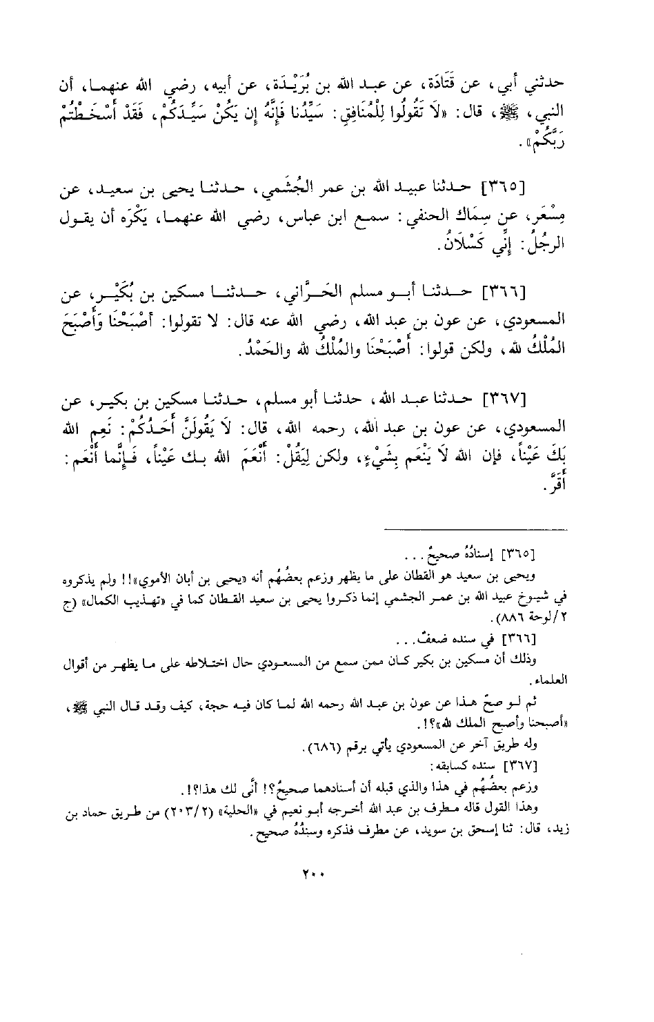 366 - حَدَّثَنَا أَبُو مُسْلِمٍ الْحَرَّانِيُّ، حَدَّثَنَا مِسْكِينُ بْنُ بُكَيْرٍ، عَنِ الْمَسْعُودِيِّ، عَنْ عَوْنِ بْنِ عَبْدِ اللَّهِ رَضِيَ اللَّهُ عَنْهُ قَالَ: " §لَا تَقُولُوا: أَصْبَحْنَا وَأَصْبَحَ الْمُلْكُ لِلَّهِ، وَلَكِنْ قُولُوا: أَصْبَحْنَا وَالْمُلْكُ لِلَّهِ وَالْحَمْدُ "