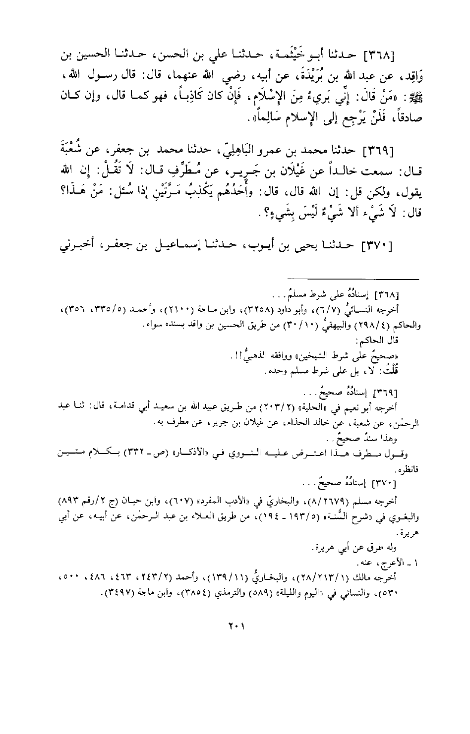 369 - حَدَّثَنَا مُحَمَّدُ بْنُ عَمْرٍو الْبَاهِلِيُّ، حَدَّثَنَا مُحَمَّدُ بْنُ جَعْفَرٍ، عَنْ شُعْبَةَ، قَالَ: سَمِعْتُ خَالِدًا، عَنْ غَيْلَانَ بْنِ جَرِيرٍ، عَنْ مُطَرِّفٍ قَالَ: " §لَا تَقُلْ: إِنَّ اللَّهَ يَقُولُ، وَلَكِنْ قُلْ: إِنَّ اللَّهَ قَالَ ". قَالَ: " وَأَحَدُهُمْ يَكْذِبُ مَرَّتَيْنِ إِذَا سُئِلَ: مَنْ هَذَا؟ قَالَ: لَا شَيْءَ، إِلَّا شَيْءٌ لَيْسَ بِشَيْءٍ "