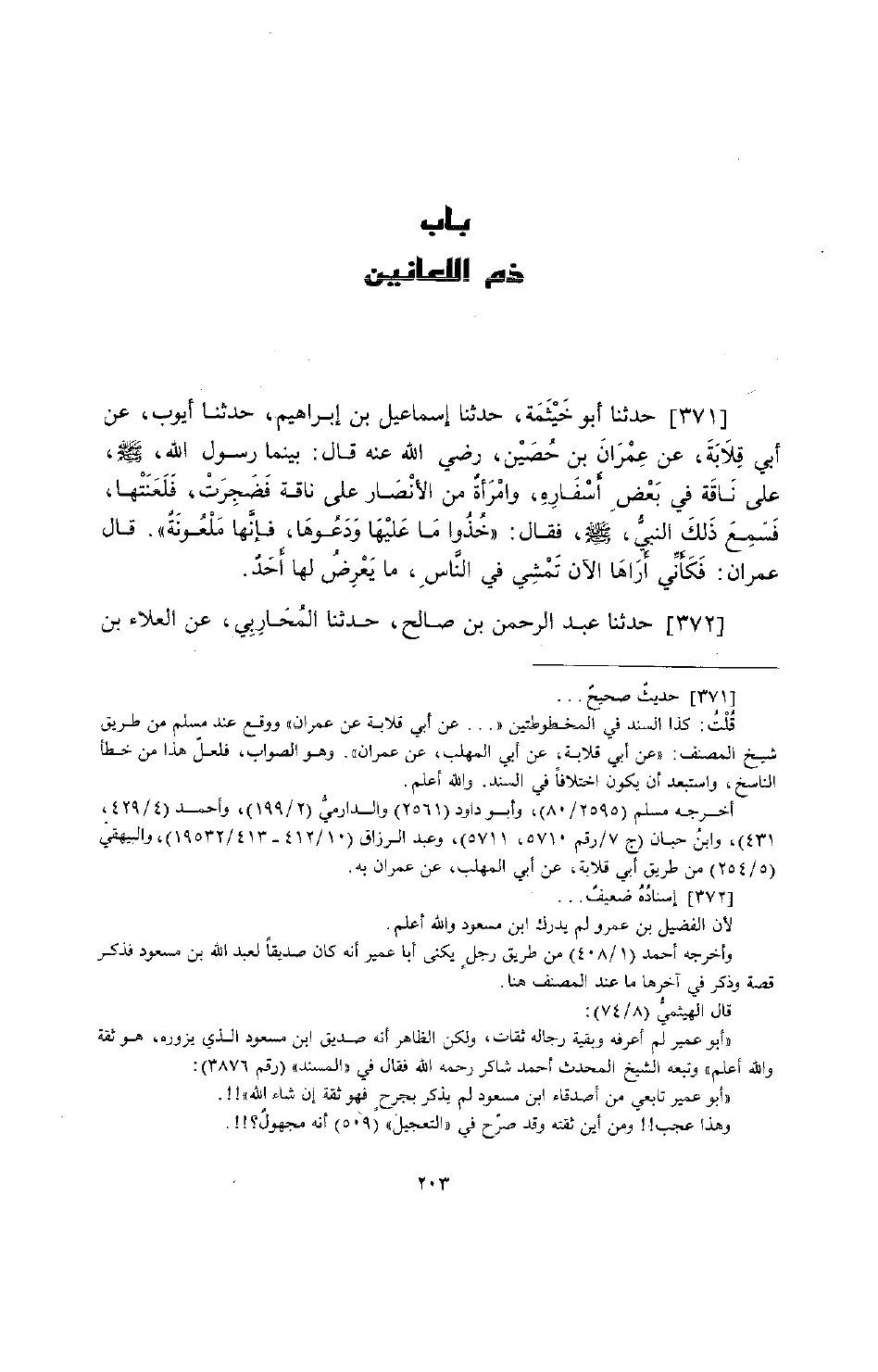 حَدَّثَنَا أَبُو خَيْثَمَةَ، حَدَّثَنَا إِسْمَاعِيلُ بْنُ إِبْرَاهِيمَ، حَدَّثَنَا أَيُّوبُ، عَنْ أَبِي قِلَابَةَ، عَنْ أَبِي الْمُهَلَّبِ عَنْ عِمْرَانَ بْنِ حُصَيْنٍ رَضِيَ اللَّهُ عَنْهُ قَالَ: بَيْنَمَا رَسُولُ اللَّهِ صَلَّى اللهُ عَلَيْهِ وَسَلَّمَ فِي بَعْضِ أَسْفَارِهِ، وَامْرَأَةٌ مِنَ الْأَنْصَارِ عَلَى نَاقَةٍ، فَضَجِرَتْ فَلَعَنَتْهَا، فَسَمِعَ ذَلِكَ النَّبِيُّ صَلَّى اللهُ عَلَيْهِ وَسَلَّمَ فَقَالَ: «§خُذُوا مَا عَلَيْهَا وَدَعُوهَا فَإِنَّهَا مَلْعُونَةٌ» قَالَ عِمْرَانُ: «فَكَأَنِّي أَرَاهَا الْآنَ تَمْشِي فِي النَّاسِ مَا يَعْرِضُ لَهَا أَحَدٌ»