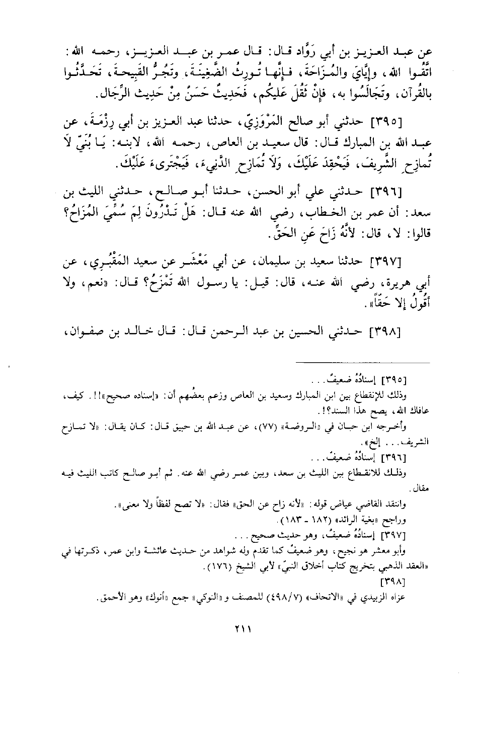 396 - حَدَّثَنِي عَلِيُّ أَبُو الْحَسَنِ، حَدَّثَنَا أَبُو صَالِحٍ، حَدَّثَنِي اللَّيْثُ بْنُ سَعْدٍ: أَنَّ عُمَرَ بْنَ الْخَطَّابِ رَضِيَ اللَّهُ عَنْهُ قَالَ: " §هَلْ تَدْرُونَ لِمَ سُمِّيَ الْمِزَاحَ؟ قَالُوا: لَا. قَالَ: لِأَنَّهُ زَاحَ عَنِ الْحَقِّ "