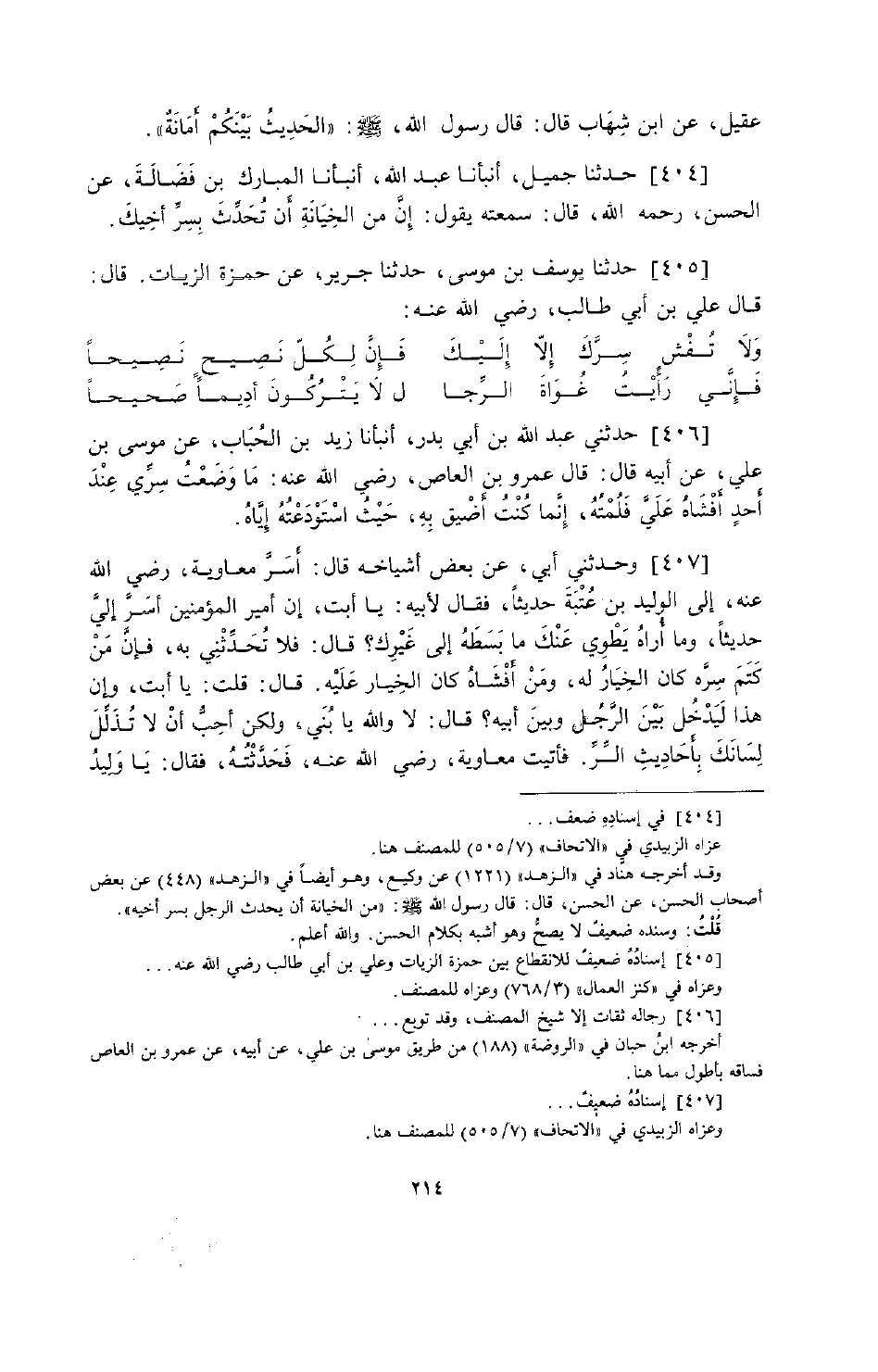 404 - حَدَّثَنَا ابْنُ جَمِيلٍ، أَخْبَرَنَا عَبْدُ اللَّهِ، أَخْبَرَنَا الْمُبَارَكُ بْنُ فَضَالَةَ، عَنِ الْحَسَنِ رَحِمَهُ اللَّهُ، قَالَ: " سَمِعْتُهُ يَقُولُ: إِنَّ §مِنَ الْخِيَانَةِ أَنْ تُحَدِّثَ بِسِرِّ أَخِيكَ "