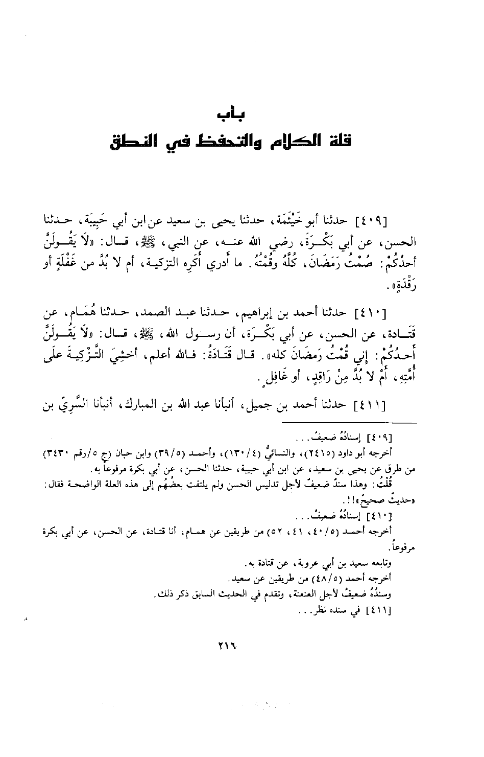 409 - حَدَّثَنَا أَبُو خَيْثَمَةَ، حَدَّثَنَا يَحْيَى بْنُ سَعِيدٍ، عَنِ الْمُهَلَّبِ بْنِ أَبِي حَبِيبَةَ، حَدَّثَنَا الْحَسَنُ، عَنْ أَبِي بَكْرَةَ رَضِيَ اللَّهُ عَنْهُ، عَنِ النَّبِيِّ صَلَّى اللهُ عَلَيْهِ وَسَلَّمَ قَالَ: «§لَا يَقُولَنَّ أَحَدُكُمْ صُمْتُ رَمَضَانَ كُلَّهُ وَقُمْتُهُ» ، قَالَ فَمَا أَدْرِي أَكَرِهَ التَّزْكِيَةَ أَمْ لَا بُدَّ مِنْ غَفْلَةٍ أَوْ رَقْدَةٍ "