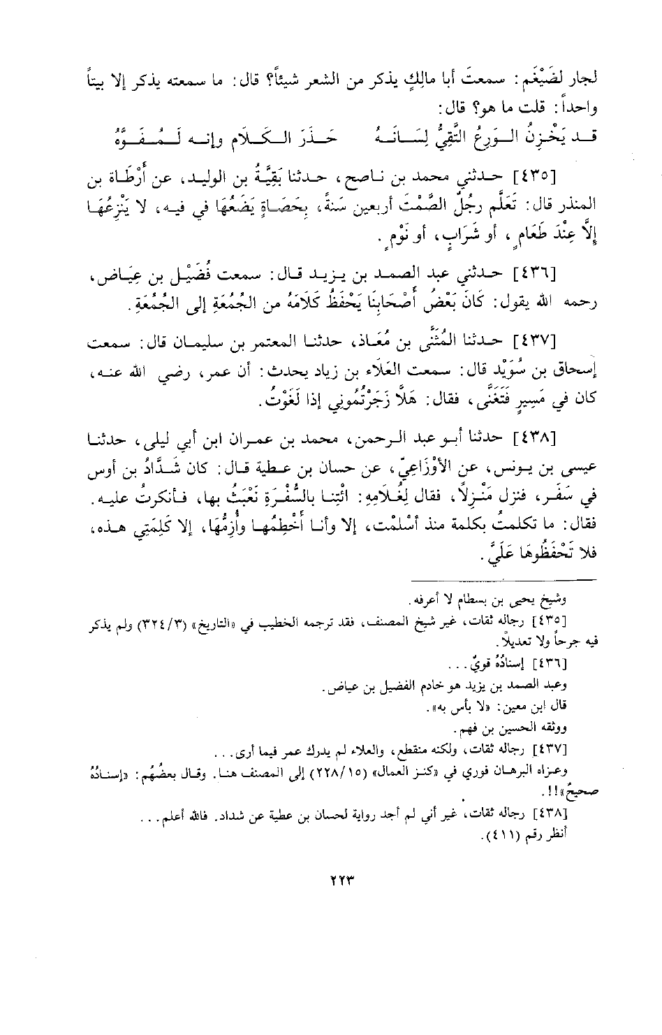 436 - حَدَّثَنِي عَبْدُ الصَّمَدِ بْنُ يَزِيدَ، قَالَ: سَمِعْتُ فُضَيْلَ بْنَ عِيَاضٍ، رَحِمَهُ اللَّهُ يَقُولُ: «كَانَ §بَعْضُ أَصْحَابِنَا يَحْفَظُ كَلَامَهُ مِنَ الْجُمُعَةِ إِلَى الْجُمُعَةِ»