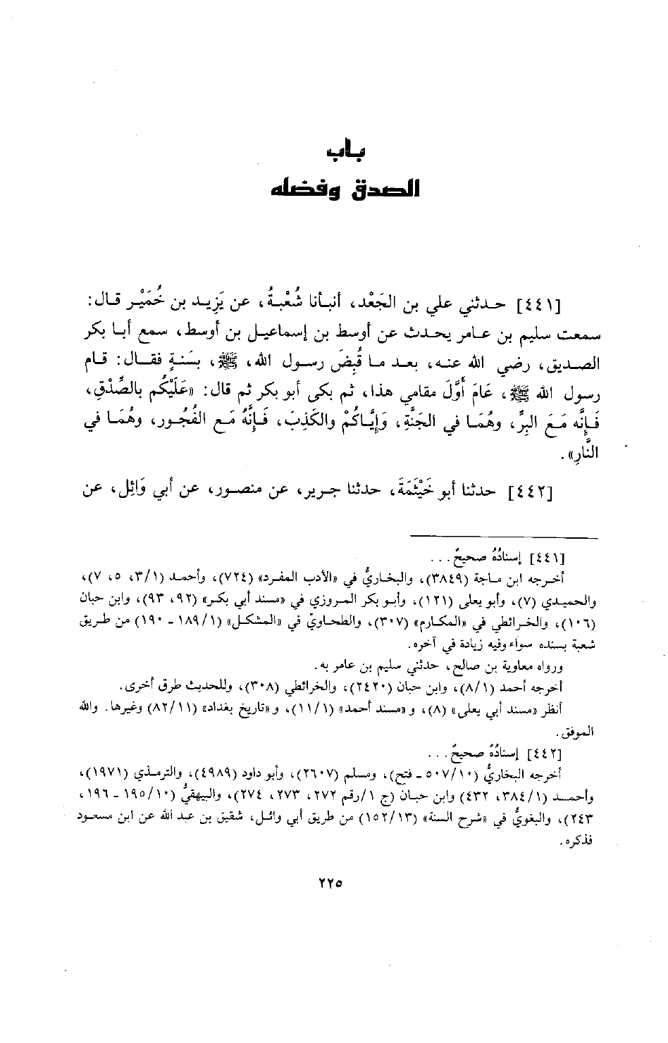 442 - حَدَّثَنَا أَبُو خَيْثَمَةَ، حَدَّثَنَا جَرِيرٌ، عَنْ مَنْصُورٍ، عَنْ أَبِي وَائِلٍ، عَنْ عَبْدِ اللَّهِ رَضِيَ اللَّهُ عَنْهُ، قَالَ: قَالَ رَسُولُ اللَّهِ صَلَّى اللهُ عَلَيْهِ وَسَلَّمَ: «إِنَّ §الصِّدْقَ يَهْدِي إِلَى الْبِرِّ، وَإِنَّ الْبِرَّ يَهْدِي إِلَى الْجَنَّةَ، وَإِنَّ الرَّجُلَ لَيَصْدُقُ حَتَّى يُكْتَبَ صِدِّيقًا»