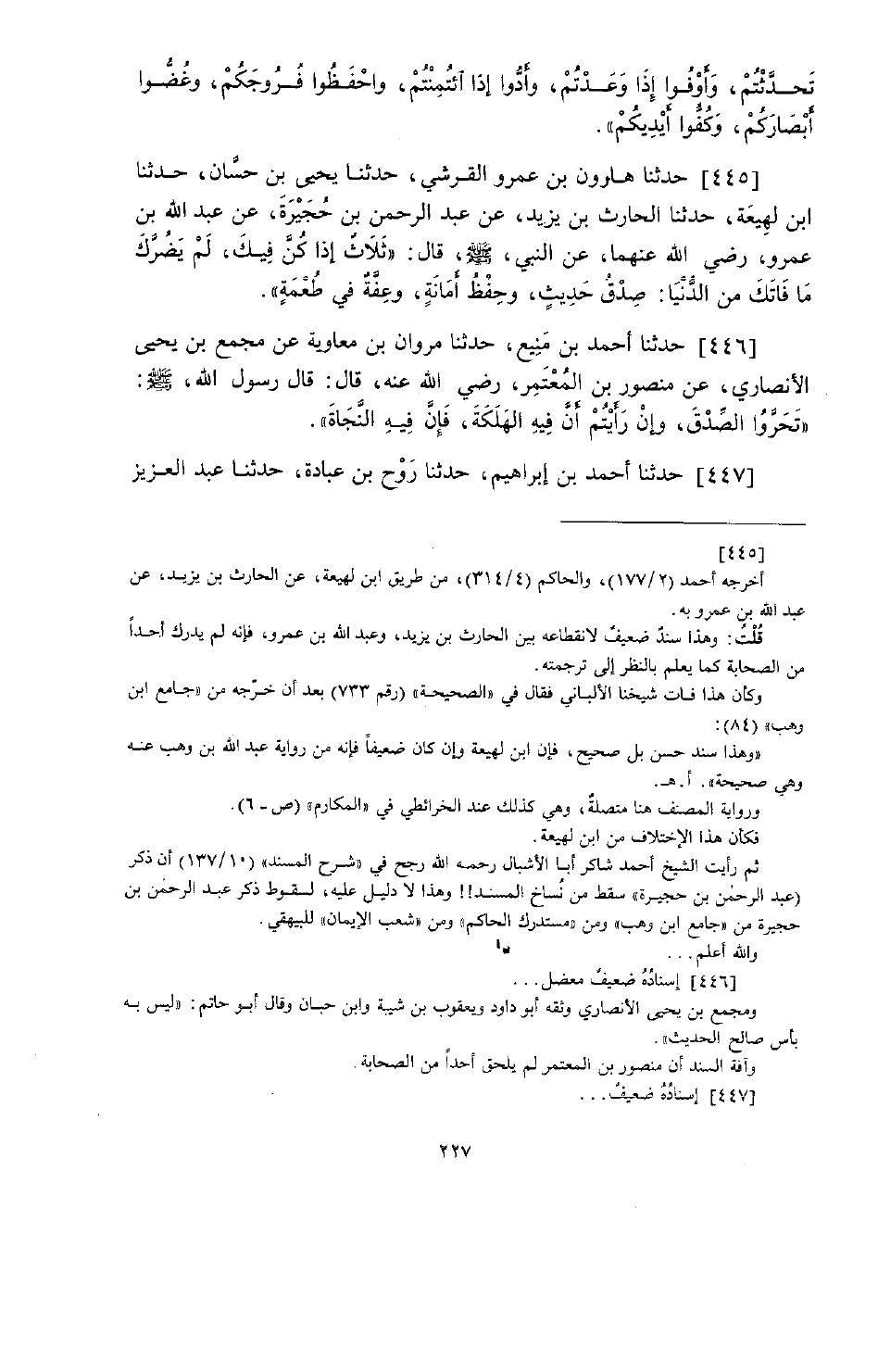 445 - حَدَّثَنَا هَارُونُ بْنُ عَمْرٍو الْقُرَشِيُّ، حَدَّثَنَا يَحْيَى بْنُ حَسَّانَ، حَدَّثَنَا ابْنُ لَهِيعَةَ، حَدَّثَنَا الْحَارِثُ بْنُ يَزِيدَ، عَنْ عَبْدِ الرَّحْمَنِ بْنِ حُجَيْرَةَ، عَنْ عَبْدِ اللَّهِ بْنِ عَمْرٍو رَضِيَ اللَّهُ عَنْهُمَا، عَنِ النَّبِيِّ صَلَّى اللهُ عَلَيْهِ وَسَلَّمَ قَالَ: " §ثَلَاثٌ إِذَا كُنَّ فِيكَ لَمْ يَضُرَّكْ مَا فَاتَكَ مِنَ الدُّنْيَا: صِدْقُ حَدِيثٍ، وَحِفْظُ أَمَانَةٍ، وَعِفَّةٌ فِي طُعْمَةٍ "