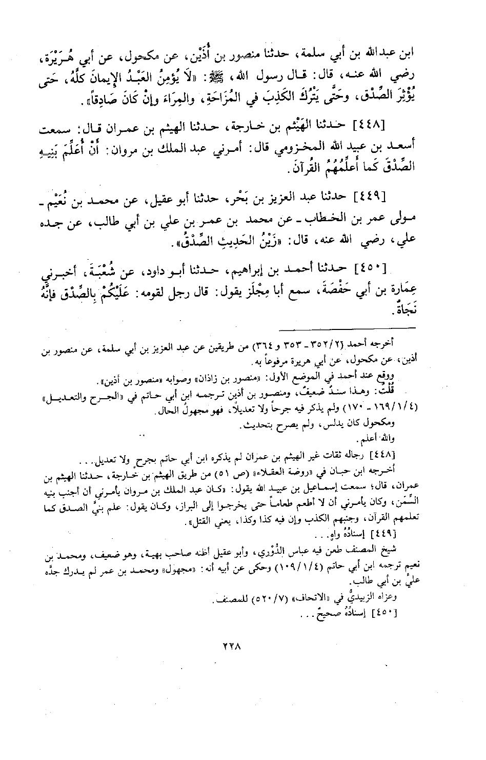 449 - حَدَّثَنَا عَبْدُ الْعَزِيزِ بْنُ بَحْرٍ، حَدَّثَنَا أَبُو عَقِيلٍ، عَنْ مُحَمَّدِ بْنِ نُعَيْمٍ، مَوْلَى عُمَرَ بْنِ الْخَطَّابِ، عَنْ مُحَمَّدِ بْنِ عُمَرَ بْنِ عَلِيِّ بْنِ أَبِي طَالِبٍ، عَنْ جَدِّهِ عَلِيٍّ رَضِيَ اللَّهُ عَنْهُ قَالَ: «§زَيْنُ الْحَدِيثِ الصِّدْقُ»