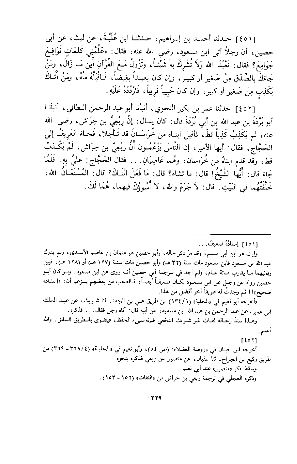 451 - حَدَّثَنَا أَحْمَدُ بْنُ إِبْرَاهِيمَ، حَدَّثَنَا ابْنُ عُلَيَّةَ، عَنْ اللَّيْثٍ، عَنْ أَبِي حُصَيْنٍ: أَنَّ رَجُلًا أَتَى ابْنَ مَسْعُودٍ رَضِيَ اللَّهُ عَنْهُ فَقَالَ: عَلِّمْني كَلِمَاتٍ نَوَافِعَ جَوَامِعَ. فَقَالَ: «§تَعْبُدُ اللَّهَ وَلَا تُشْرِكُ بِهِ شَيْئًا، وَتَزُولُ مَعَ الْقُرْآنِ أَيْنَ مَا زَالَ، وَمَنْ جَاءَكَ بِالصِّدْقِ مِنْ صَغِيرٍ أَوْ كَبِيرٍ، وَإِنْ كَانَ بَعِيدًا بَغِيضًا فَاقْبَلْهُ مِنْهُ، وَمَنْ أَتَاكَ يَكْذِبُ مِنْ صَغِيرٍ أَوْ كَبِيرٍ، وَإِنْ كَانَ حَبِيبًا قَرِيبًا فَارْدُدْهُ عَلَيْهِ»