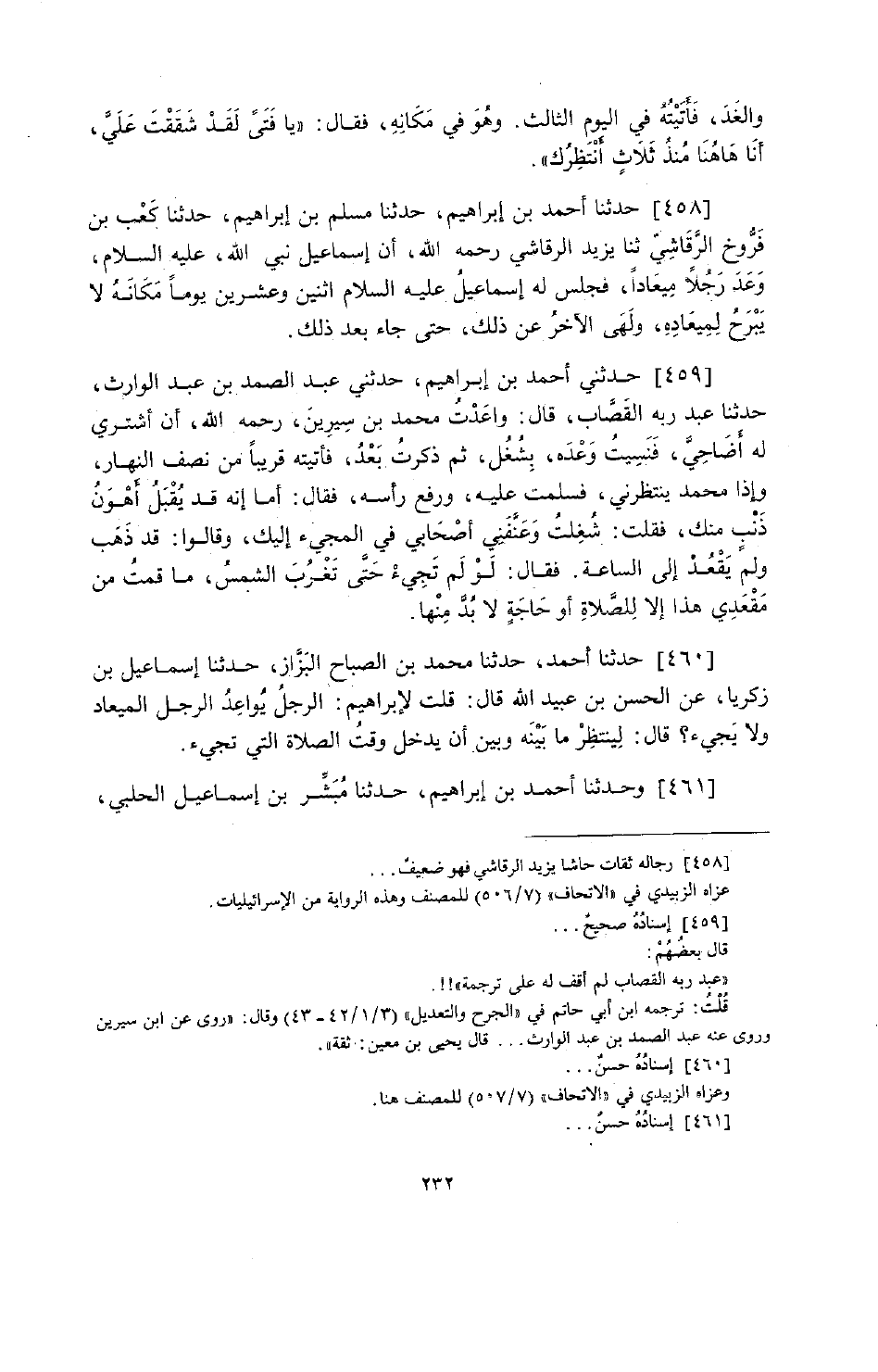 458 - حَدَّثَنَا أَحْمَدُ بْنُ إِبْرَاهِيمَ، حَدَّثَنَا مُسْلِمُ بْنُ إِبْرَاهِيمَ، حَدَّثَنَا كَعْبُ بْنُ فَرُّوخَ الرَّقَاشِيُّ، حَدَّثَنَا يَزِيدُ الرَّقَاشِيُّ رَحِمَهُ اللَّهُ: «§أَنَّ إِسْمَاعِيلَ نَبِيَّ اللَّهِ عَلَيْهِ السَّلَامُ وَعَدَ رَجُلًا مِيعَادًا، فَجَلَسَ لَهُ إِسْمَاعِيلُ عَلَيْهِ السَّلَامُ اثْنَيْنِ وَعِشْرِينَ يَوْمًا مَكَانَهُ لَا يَبْرَحُ لِمِيعَادِهِ، وَلَهَى الْآخَرُ عَنْ ذَلِكَ حَتَّى جَاءَ بَعْدَ ذَلِكَ»