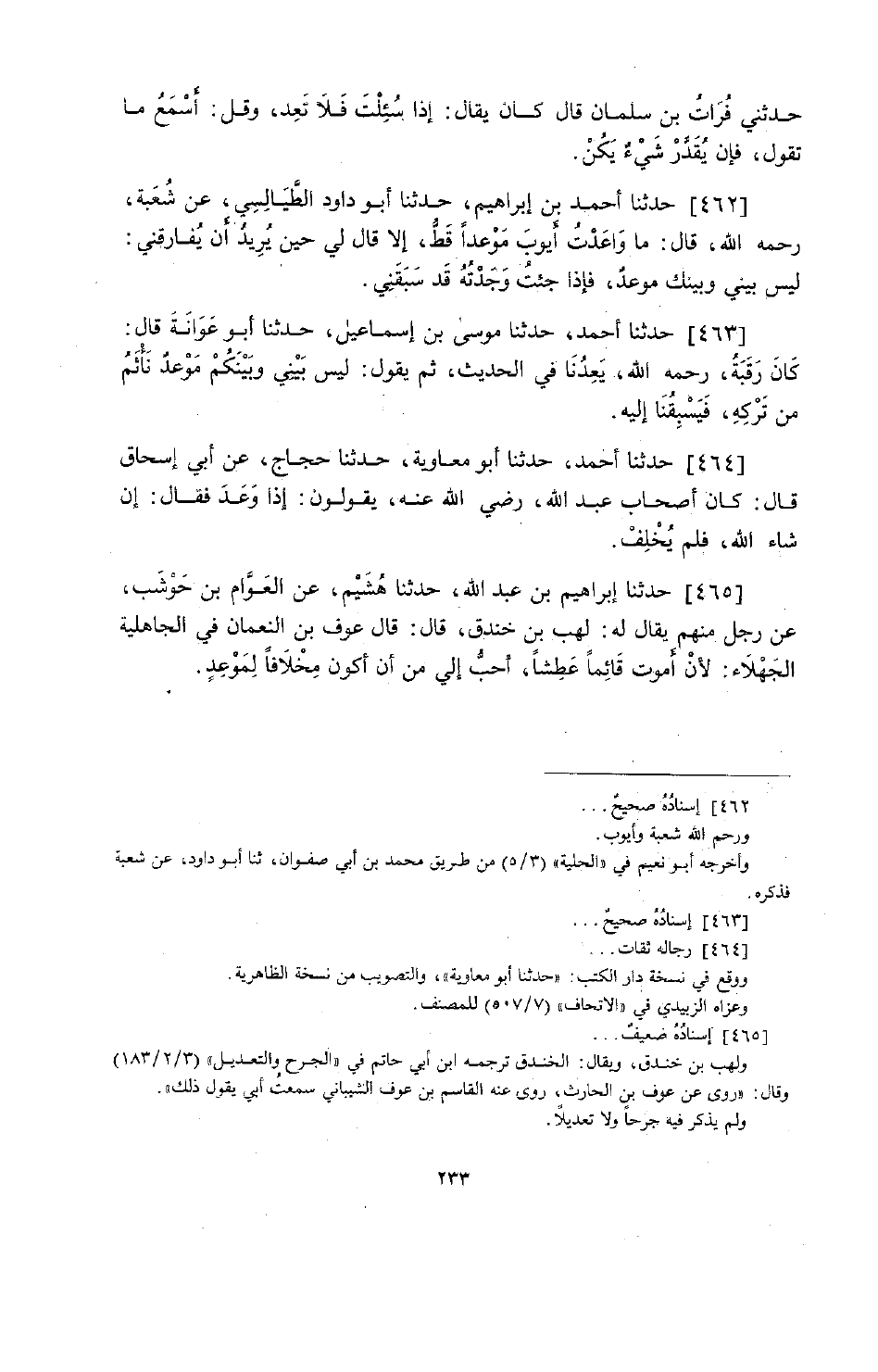 463 - حَدَّثَنَا أَحْمَدُ، حَدَّثَنَا مُوسَى بْنُ إِسْمَاعِيلَ، حَدَّثَنَا أَبُو عَوَانَةَ قَالَ: كَانَ رَقَبَةُ، رَحِمَهُ اللَّهُ يَعِدُنَا فِي الْحَدِيثِ ثُمَّ يَقُولُ: «§لَيْسَ بَيْنِي وَبَيْنَكُمْ مَوْعِدٌ نَأْثَمُ مِنْ تَرْكِهِ، فَيَسْبِقُنَا إِلَيْهِ»