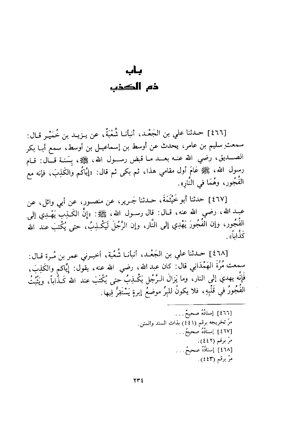 468 - حَدَّثَنَا عَلِيُّ بْنُ الْجَعْدِ، أَخْبَرَنَا شُعْبَةُ، أَخْبَرَنِي عُمَرُ بْنُ مُرَّةَ قَالَ: سَمِعْتُ مُرَّةَ الْهَمْدَانِيَّ، قَالَ: كَانَ عَبْدُ اللَّهِ رَضِيَ اللَّهُ عَنْهُ يَقُولُ: «§إِيَّاكُمْ وَالْكَذِبَ فَإِنَّهُ يَهْدِي إِلَى النَّارِ، وَمَا يَزَالُ الرَّجُلُ يَكْذِبُ حَتَّى يُكْتَبَ عِنْدَ اللَّهِ كَذَّابًا، وَيَثْبُتَ الْفُجُورُ فِي قَلْبِهِ فَلَا يَكُونُ لِلْبِرِّ مَوْضِعُ إِبْرَةٍ يَسْتَقِرُّ فِيهَا»