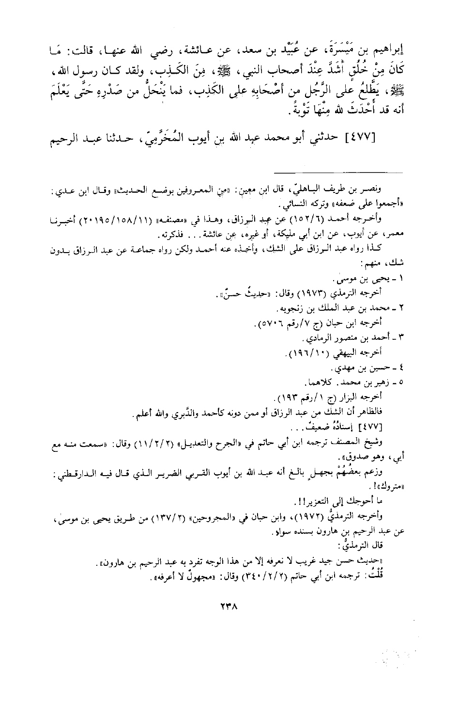 477 - حَدَّثَنِي أَبُو مُحَمَّدٍ عَبْدُ اللَّهِ بْنُ أَيُّوبَ الْمُخَرِّمِيُّ، حَدَّثَنَا عَبْدُ الرَّحِيمِ بْنُ هَارُونَ أَبُو هِشَامٍ الْغَسَّانَيُّ، عَنْ عَبْدِ الْعَزِيزِ بْنِ أَبِي رَوَّادٍ، عَنْ نَافِعٍ، عَنِ ابْنِ عُمَرَ رَضِيَ اللَّهُ عَنْهُمَا رَفَعَهُ قَالَ: «إِنَّ §الْعَبْدَ لَيَكْذِبُ الْكَذِبَةَ فَيَتَبَاعَدُ الْمَلَكُ مِنْهُ مِيلًا أَوْ مِيلَيْنِ، مِمَّا جَاءَ بِهِ»