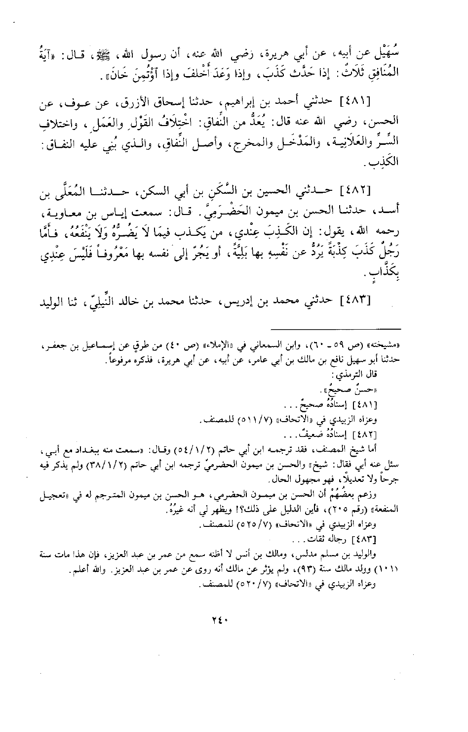 481 - حَدَّثَنَا أَحْمَدُ بْنُ إِبْرَاهِيمَ، حَدَّثَنَا إِسْحَاقُ الْأَزْرَقُ، عَنْ عَوْفٍ، عَنِ الْحَسَنِ رَضِيَ اللَّهُ عَنْهُ قَالَ: " §يُعَدُّ مِنَ النِّفَاقِ: اخْتِلَافُ الْقَوْلِ وَالْعَمَلِ، وَاخْتِلَافُ السِّرِّ وَالْعَلَانِيَةِ، وَالْمَدْخَلِ وَالْمَخْرَجِ، وَأَصْلُ النِّفَاقِ، وَالَّذِي بُنِيَ عَلَيْهِ النِّفَاقُ: الْكَذِبُ "