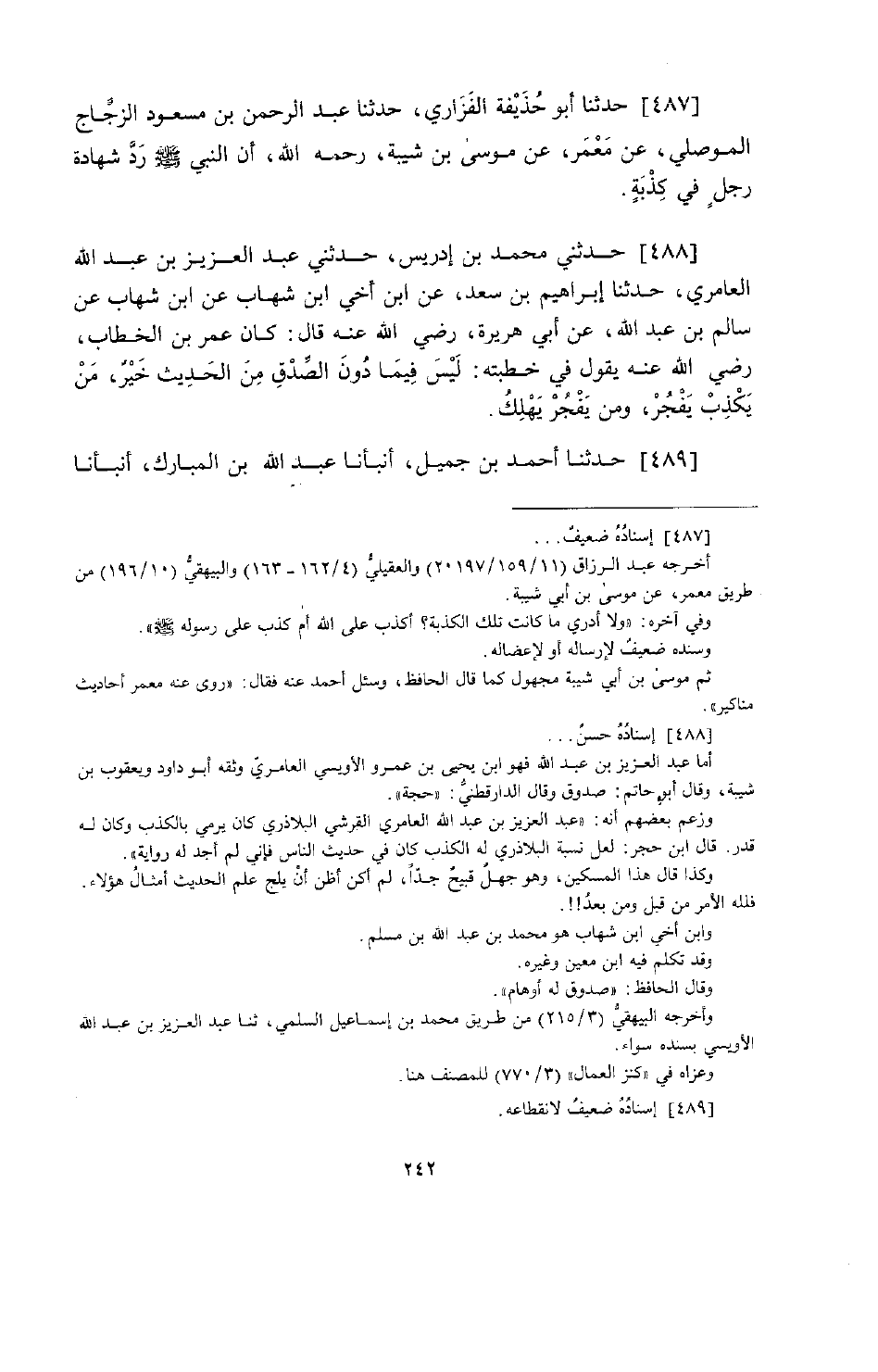 489 - حَدَّثَنَا أَحْمَدُ بْنُ جَمِيلٍ، أَخْبَرَنَا عَبْدُ اللَّهِ بْنُ الْمُبَارَكِ، أَخْبَرَنَا الْأَوْزَاعِيُّ، حَدَّثَنِي حَسَّانُ بْنُ عَطِيَّةَ: أَنَّ عُمَرَ بْنَ الْخَطَّابِ رَضِيَ اللَّهُ عَنْهُ قَالَ: «§لَا تَجِدُ الْمُؤْمِنَ كَذَّابًا»