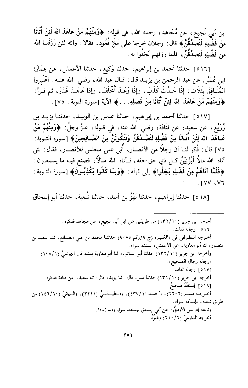 517 - حَدَّثَنَا أَحْمَدُ بْنُ إِبْرَاهِيمَ، حَدَّثَنَا عَبَّاسُ بْنُ الْوَلِيدِ، حَدَّثَنَا يَزِيدُ بْنُ زُرَيْعٍ، عَنْ سَعِيدٍ، عَنْ قَتَادَةَ رَضِيَ اللَّهُ عَنْهُ، فِي قَوْلِهِ عَزَّ وَجَلَّ: {وَمِنْهُمْ مَنْ عَاهَدَ اللَّهَ لَئِنْ آتَانَا مِنْ فَضْلِهِ لَنَصَّدَّقَنَّ وَلَنَكُونَنَّ مِنَ الصَّالِحِينَ} [التوبة: 75] قَالَ: " ذُكِرَ لَنَا أَنَّ §رَجُلًا مِنَ الْأَنْصَارِ أَتَى عَلَى مَجْلِسٍ لِلْأَنْصَارِ فَقَالَ: لَئِنْ آتَاهُ اللَّهُ مَالًا لَيُؤْتِيَنَّ كُلَّ ذِي حَقٍّ حَقَّهُ، فَآتَاهُ اللَّهُ مَالًا، فَصَنَعَ فِيهِ مَا يَسْمَعُونَ ": {فَلَمَّا آتَاهُمْ مِنْ فَضْلِهِ بَخِلُوا بِهِ} [التوبة: 76] إِلَى قَوْلِهِ {وَبِمَا كَانُوا يَكْذِبُونَ} [التوبة: 77]