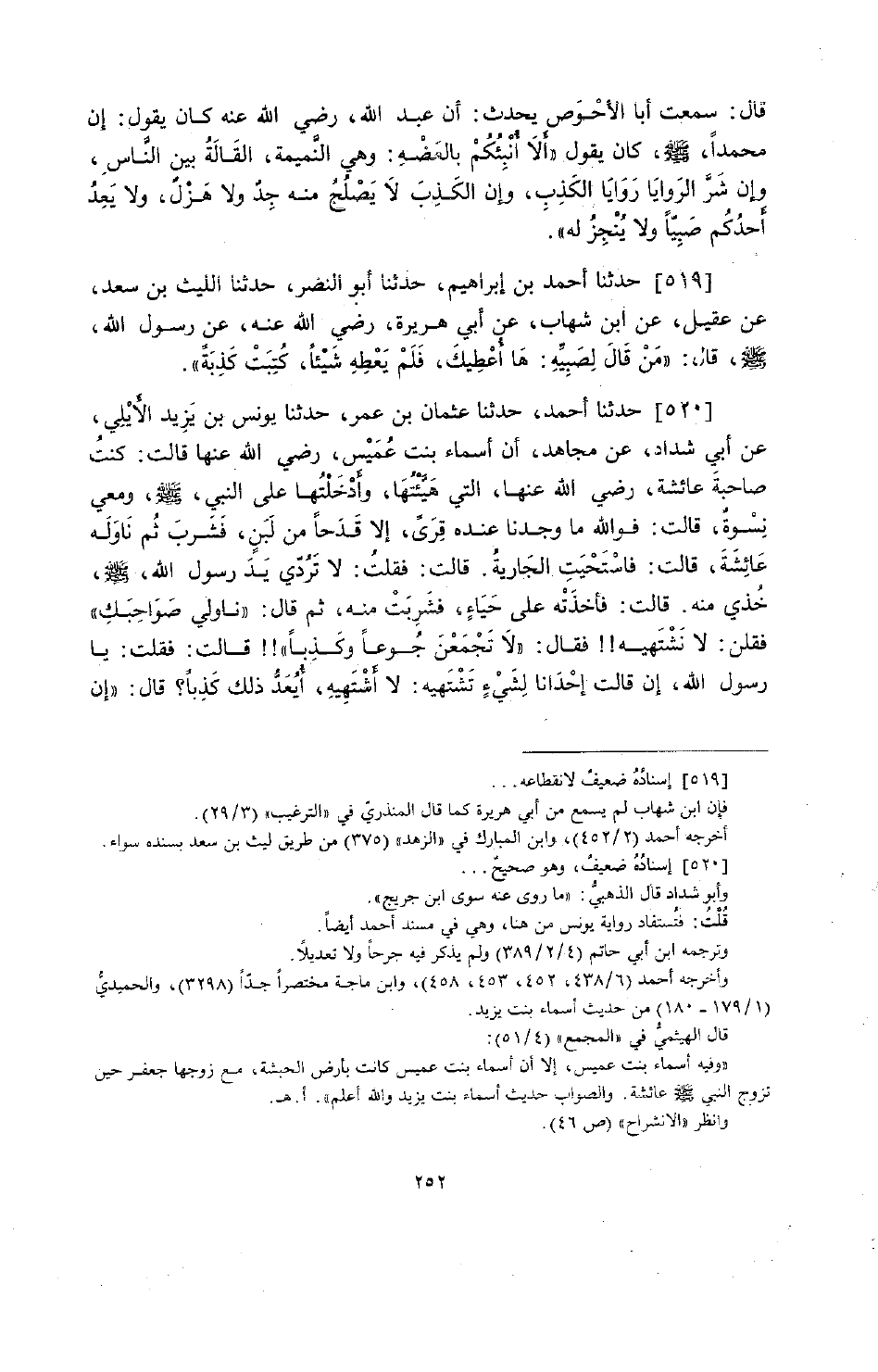 520 - حَدَّثَنَا أَحْمَدُ، حَدَّثَنَا عُثْمَانُ بْنُ عُمَرَ، حَدَّثَنَا يُونُسُ بْنُ يَزِيدَ الْأَيْلِيُّ، عَنْ أَبِي شَدَّادٍ، عَنْ مُجَاهِدٍ، أَخْبَرَتْنَا أَسْمَاءُ بِنْتُ عُمَيْسٍ رَضِيَ اللَّهُ عَنْهَا قَالَتْ: كُنْتُ صَاحِبَةَ عَائِشَةَ رَضِيَ اللَّهُ عَنْهَا الَّتِي هَيَّأْتُهَا وَأَدْخَلْتُهَا عَلَى النَّبِيِّ صَلَّى اللهُ عَلَيْهِ وَسَلَّمَ وَمَعِي نِسْوَةٌ قَالَتْ: فَوَاللَّهِ مَا وَجَدْنَا عِنْدَهُ قِرَاءً إِلَّا قَدَحًا مِنْ لَبَنٍ فَشَرِبَ، ثُمَّ نَاوَلَهُ عَائِشَةَ، قَالَتْ: فَاسْتَحْيَتِ الْجَارِيَةُ، قَالَتْ: فَقُلْتُ: لَا تَرُدِّي يَدَ رَسُولِ اللَّهِ صَلَّى اللهُ عَلَيْهِ وَسَلَّمَ خُذِي مِنْهُ، قَالَتْ: فَأَخَذَتْهُ عَلَى حَيَاءٍ فَشَرِبَتْ مِنْهُ، ثُمَّ قَالَ: «نَاوِلِي صَوَاحِبَكِ» فَقُلْنَ: لَا نَشْتَهِيهِ، فَقَالَ: «لَا تَجْمَعْنَ جُوعًا وَكَذِبًا» قَالَتْ: فَقُلْتُ: يَا رَسُولَ اللَّهِ، إِنْ قَالَتْ إِحْدَانَا لِشَيْءٍ تَشْتَهِيهِ: لَا أَشْتَهِيهِ، أَيُعَدُّ ذَلِكَ كَذِبًا؟ قَالَ: «وَإِنَّ §-[253]- الْكَذِبَ لَيُكْتَبُ كَذِبًا، حَتَّى الْكُذَيْبَةُ كُذَيْبَةً»