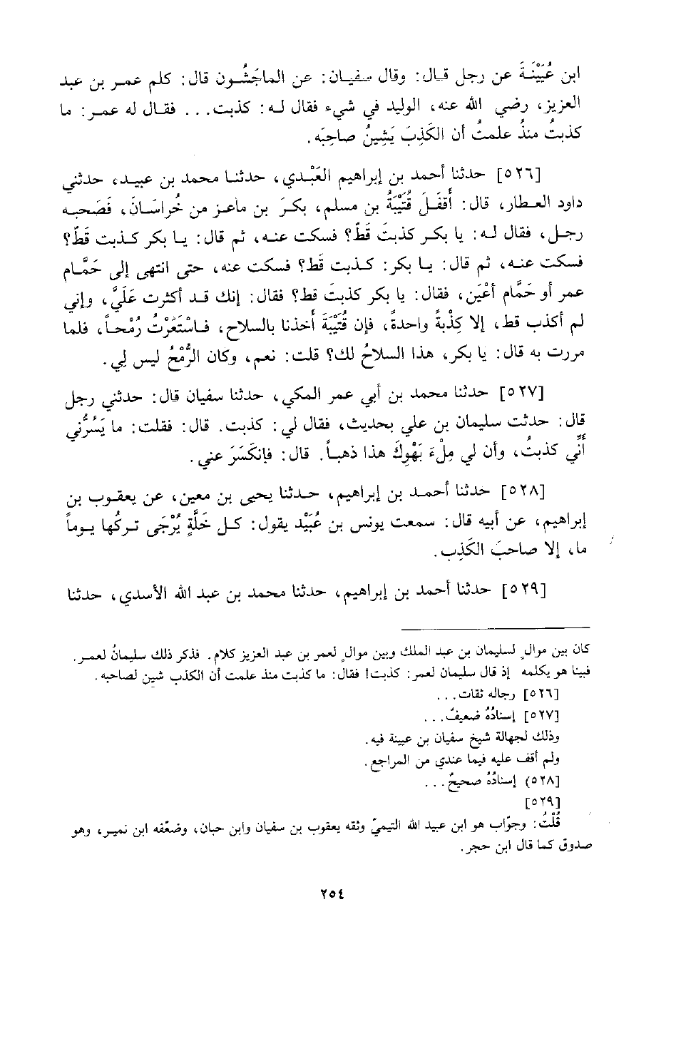 527 - حَدَّثَنَا مُحَمَّدُ بْنُ أَبِي عُمَرَ الْمَكِّيُّ، حَدَّثَنَا سُفْيَانُ، قَالَ: حَدَّثَنِي رَجُلٌ، قَالَ: حَدَّثْتُ سُلَيْمَانَ بْنَ عَلِيٍّ، بِحَدِيثٍ فَقَالَ لِي: «§كَذَبْتَ» . قَالَ: فَقُلْتُ: مَا يَسُرُّنِي أَنِّي كَذَبْتُ وَأَنَّ لِي مِلْءَ بَهْوِكَ هَذَا ذَهَبًا. قَالَ: فَانْكَسَرَ عَنِّي