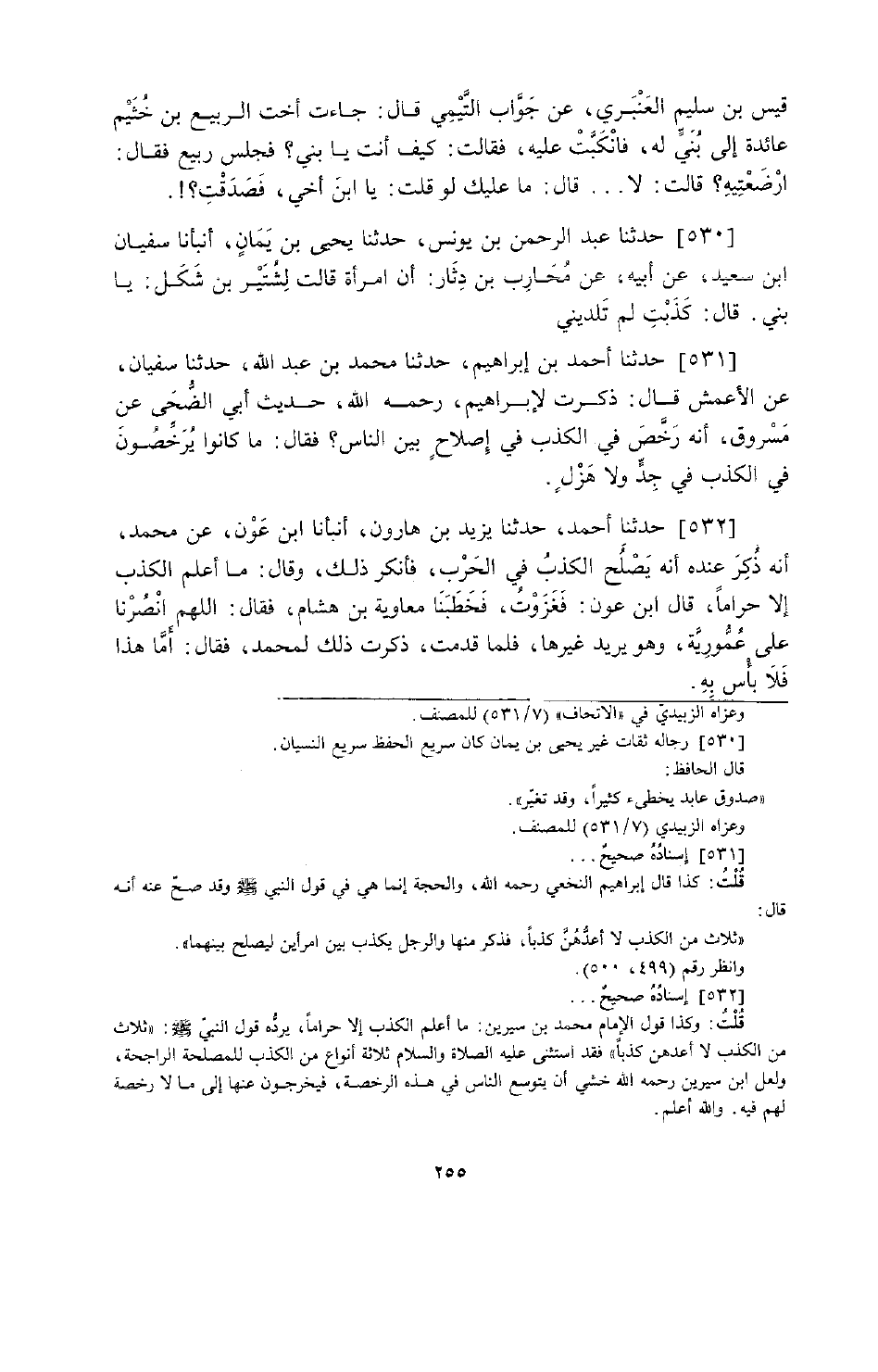 531 - حَدَّثَنَا أَحْمَدُ بْنُ إِبْرَاهِيمَ، حَدَّثَنَا مُحَمَّدُ بْنُ عَبْدِ اللَّهِ، حَدَّثَنَا سُفْيَانُ، عَنِ الْأَعْمَشِ، قَالَ: ذَكَرْتُ لِإِبْرَاهِيمَ رَحِمَهُ اللَّهُ حَدِيثَ أَبِي الضُّحَى، عَنْ مَسْرُوقٍ أَنَّهُ رَخَّصَ فِي الْكَذِبِ فِي إِصْلَاحٍ بَيْنَ النَّاسِ، فَقَالَ: «§مَا كَانُوا يُرَخِّصُونَ فِي الْكَذِبِ فِي جَدٍّ وَلَا هَزْلٍ»