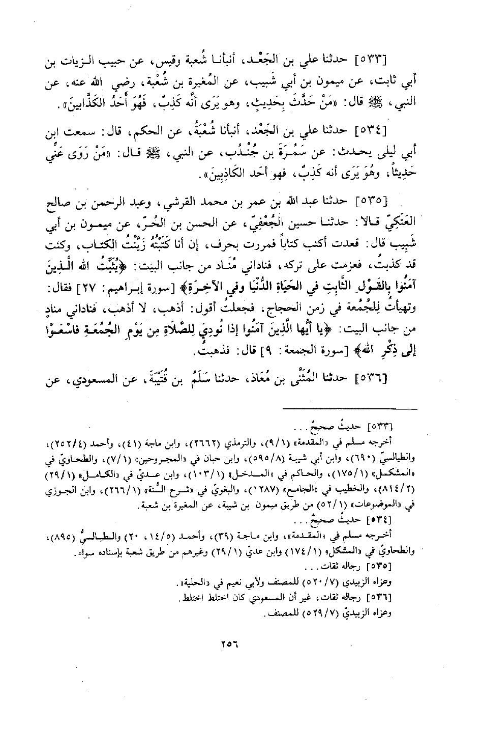 533 - حَدَّثَنَا عَلِيُّ بْنُ الْجَعْدِ، أَخْبَرَنَا شُعْبَةُ، وَقَيْسٌ، عَنْ حَبِيبِ بْنِ أَبِي ثَابِتٍ، عَنْ مَيْمُونِ بْنِ أَبِي شَبِيبٍ، عَنِ الْمُغِيرَةِ بْنِ شُعْبَةَ رَضِيَ اللَّهُ عَنْهُ، عَنِ النَّبِيِّ صَلَّى اللهُ عَلَيْهِ وَسَلَّمَ قَالَ: «§مَنْ حَدَّثَ بِحَدِيثٍ وَهُوَ يَرَى أَنَّهُ كَذِبٌ، فَهُوَ أَحَدُ الْكَاذِبِينَ»