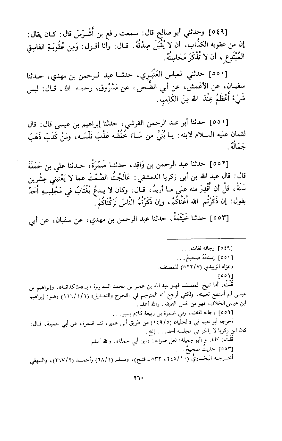 550 - حَدَّثَنِي الْعَبَّاسُ الْعَنْبَرِيُّ، حَدَّثَنَا عَبْدُ الرَّحْمَنِ بْنُ مَهْدِيٍّ، حَدَّثَنَا سُفْيَانُ، عَنِ الْأَعْمَشِ، عَنْ أَبِي الضُّحَى، عَنْ مَسْرُوقٍ رَحِمَهُ اللَّهُ قَالَ: «§لَيْسَ شَيْءٌ أَعْظَمَ عِنْدَ اللَّهِ مِنَ الْكَذِبِ»