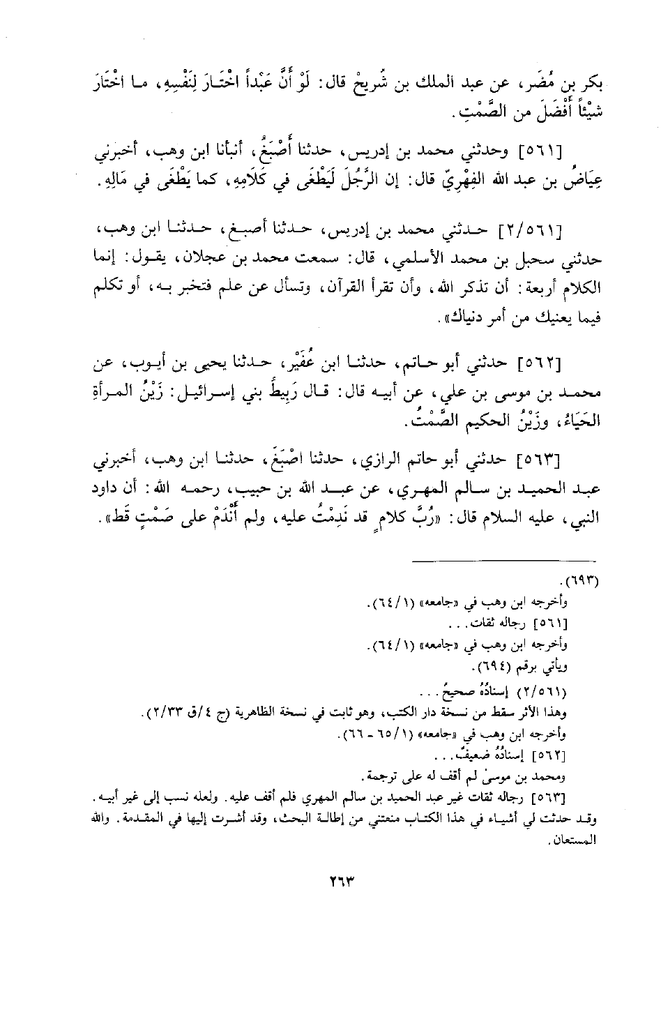 563 - حَدَّثَنِي أَبُو حَاتِمٍ الرَّازِيُّ، حَدَّثَنَا أَصْبَغُ، حَدَّثَنَا ابْنُ وَهْبٍ، أَخْبَرَنِي ابْنُ عَبْدِ الْحَمِيدِ بْنِ سَالِمٍ الْمَهْرِيِّ، عَنْ عَبْدِ اللَّهِ بْنِ حَبِيبٍ رَحِمَهُ اللَّهُ: " أَنَّ §دَاوُدَ النَّبِيَّ عَلَيْهِ السَّلَامُ قَالَ: رُبَّ كَلَامٍ قَدْ نَدِمْتُ عَلَيْهِ وَلَمْ أَنْدَمْ عَلَى صَمْتٍ قَطُّ "