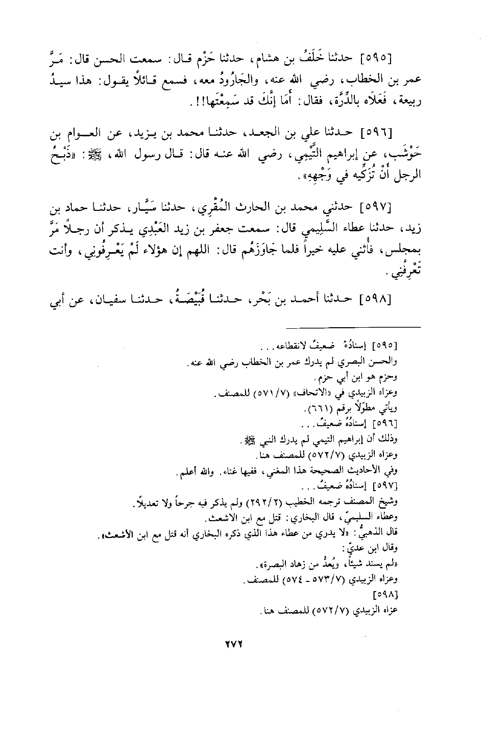 596 - حَدَّثَنَا عَلِيُّ بْنُ الْجَعْدِ، حَدَّثَنَا مُحَمَّدُ بْنُ يَزِيدَ، عَنِ الْعَوَّامِ بْنِ حَوْشَبٍ، عَنْ إِبْرَاهِيمَ التَّيْمِيِّ رَضِيَ اللَّهُ عَنْهُ قَالَ: قَالَ رَسُولُ اللَّهِ صَلَّى اللهُ عَلَيْهِ وَسَلَّمَ: «§ذَبْحُ الرَّجُلِ أَنْ تُزَكِّيَهُ فِي وَجْهِهِ»