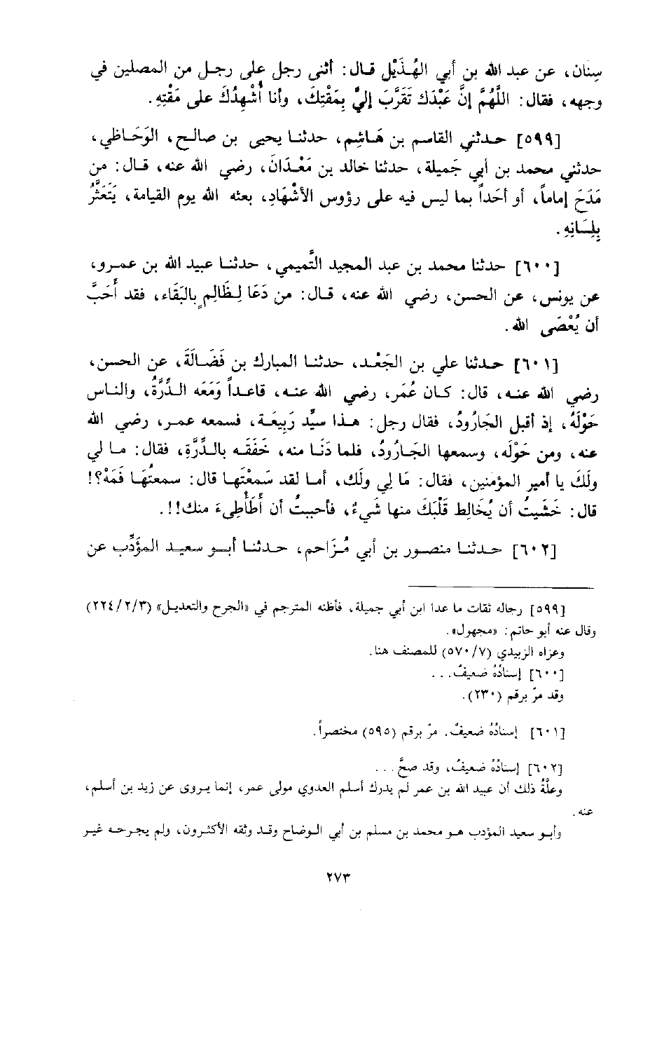 601 - حَدَّثَنَا عَلِيُّ بْنُ الْجَعْدِ، حَدَّثَنَا الْمُبَارَكُ بْنُ فَضَالَةَ، عَنِ الْحَسَنِ رَضِيَ اللَّهُ عَنْهُ قَالَ: كَانَ عُمَرُ رَضِيَ اللَّهُ عَنْهُ قَاعِدًا وَمَعَهُ الدِّرَّةُ، وَالنَّاسُ حَوْلَهُ إِذْ أَقْبَلَ الْجَارُودُ فَقَالَ رَجُلٌ: هَذَا سَيِّدُ رَبِيعَةَ , فَسَمِعَهُ عُمَرُ رَضِيَ اللَّهُ عَنْهُ وَمَنْ حَوْلَهُ، وَسَمِعَهَا الْجَارُودُ، فَلَمَّا دَنَا مِنْهُ خَفَقَهُ بِالدِّرَّةِ، فَقَالَ: مَا لِي وَلَكَ يَا أَمِيرَ الْمُؤْمِنِينَ؟ فَقَالَ: «مَا لِي وَلَكَ، أَمَا لَقَدْ سَمِعْتَهَا» قَالَ: سَمِعْتُهَا؟ قَالَ: «§خَشِيتُ أَنْ يُخَالِطَ قَلْبَكَ مِنْهَا شَيْءٌ، فَأَحْبَبْتُ أَنْ أُطَأْطِئَ مِنْكَ»