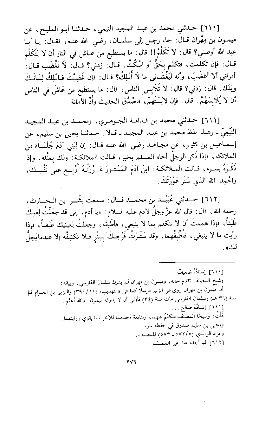 610 - حَدَّثَنِي مُحَمَّدُ بْنُ عَبْدِ الْمَجِيدِ التَّمِيمِيُّ، حَدَّثَنَا أَبُو الْمَلِيحِ، عَنْ مَيْمُونِ بْنِ مِهْرَانَ قَالَ: جَاءَ رَجُلٌ إِلَى سَلْمَانَ رَضِيَ اللَّهُ عَنْهُ فَقَالَ: يَا أَبَا عَبْدِ اللَّهِ، أَوْصِنِي. قَالَ: «§لَا تَكَلَّمْ» ، قَالَ: مَا يَسْتَطِيعُ مَنْ عَاشَ فِي النَّاسِ أَنْ لَا يَتَكَلَّمَ. قَالَ: «فَإِنْ تَكَلَّمْتَ فَتَكَلَّمْ بِحَقٍّ أَوِ اسْكُتْ» ، قَالَ: زِدْنِي. قَالَ: «لَا تَغْضَبْ» ، قَالَ: أَمَرْتَنِي أَلَّا أَغْضَبَ، وَإِنَّهُ لَيَغْشَانِي مَا لَا أَمْلِكُ. قَالَ: «فَإِنْ غَضِبْتَ فَامْلُكْ لِسَانَكَ وَيَدَكَ» ، قَالَ: زِدْنِي. قَالَ: «لَا تُلَابِسِ النَّاسَ» ، قَالَ: مَا يَسْتَطِيعُ مَنْ عَاشَ فِي النَّاسِ أَنْ لَا يُلَابِسَهُمْ. قَالَ: «فَإِنْ لَابَسْتَهُمْ فَاصْدُقِ الْحَدِيثَ وَأَدِّ الْأَمَانَةَ»