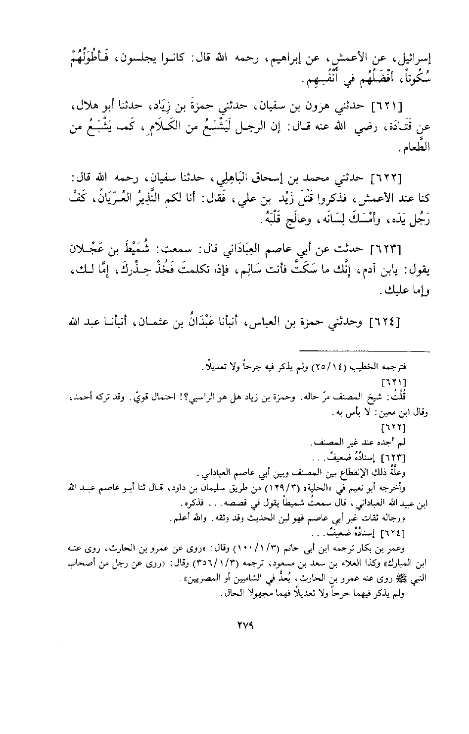 621 - حَدَّثَنِي هَارُونُ بْنُ سُفْيَانَ، حَدَّثَنِي حَمْزَةُ بْنُ زِيَادٍ، حَدَّثَنَا أَبُو هِلَالٍ، عَنْ قَتَادَةَ رَضِيَ اللَّهُ عَنْهُ قَالَ: «إِنَّ §الرَّجُلَ لَيَشْبَعُ مِنَ الْكَلَامِ كَمَا يَشْبَعُ مِنَ الطَّعَامِ»