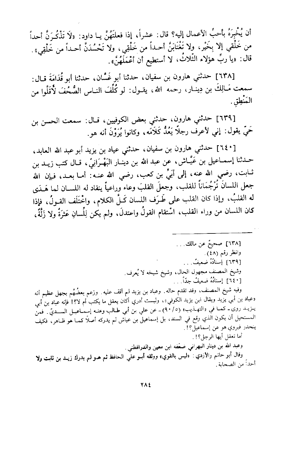 640 - حَدَّثَنِي هَارُونُ بْنُ سُفْيَانَ، حَدَّثَنِي عَبَّادُ بْنُ يَزِيدَ أَبُو عَبْدِ اللَّهِ الْعَابِدُ، حَدَّثَنَا إِسْمَاعِيلُ بْنُ عَيَّاشٍ، عَنْ عَبْدِ اللَّهِ بْنِ دِينَارٍ الْبَهْرَانِيِّ، قَالَ: كَتَبَ زَيْدُ بْنُ ثَابِتٍ رَضِيَ اللَّهُ عَنْهُ إِلَى أُبَيِّ بْنِ كَعْبٍ رَضِيَ اللَّهُ عَنْهُ: «أَمَّا بَعْدُ، فَإِنَّ §اللَّهَ جَعَلَ اللِّسَانَ تَرْجُمَانًا لِلْقَلْبِ، وَجَعَلَ الْقَلْبَ وِعَاءً وَدَاعِيًا يَنْقَادُ لَهُ اللِّسَانُ، لِمَا هُدِيَ لَهُ الْقَلْبُ، وَإِذَا كَانَ الْقَلْبُ عَلَى طَرَفِ اللِّسَانِ كُلَّ الْكَلَامُ وَاخْتَلَفَ الْقَوْلُ، فَإِذَا كَانَ اللِّسَانُ مِنْ وَرَاءِ الْقَلْبِ اسْتَقَامَ الْقَوْلُ وَاعْتَدَلَ وَلَمْ يَكُنْ لِلِّسَانِ عَثْرَةٌ، وَلَا زَلَّةٌ -[285]-، وَلَا حِلْمَ، لِمَنْ لَمْ يَكُنْ قَلْبُهُ بَيْنِ يَدَيْ لِسَانِهِ، فَإِذَا بَذَلَ الرَّجُلُ كَلَامَهُ بِلِسَانِهِ، وَخَالَفَ عَلَى ذَلِكَ قَلْبَهُ، خَدَعَ بِذَلِكَ نَفْسَهُ، وَإِذَا وَزَنَ الرَّجُلُ كَلَامَهُ بِفِعْلِهِ صَدَّقَ ذَلِكَ مَوَاقِعَ حَدِيثِهِ، تَذَكَّرْ هَلْ وَجَدْتَ بَخِيلًا إِلَّا وَهُوَ يَجُودُ بِالْقَوْلِ، وَيَضِنُّ بِالْفِعْلِ، وَذَلِكَ لِأَنَّ لِسَانَهُ بَيْنَ يَدَيْ قَلْبِهِ، تَذَكَّرْ هَلْ تَجِدُ عِنْدَ أَحَدٍ شَرَفًا مُرُوءَةً إِذَا لَمْ يَحْفَظْ مَا قَالَ ثُمَّ يُتْبِعْهُ، وَيَقُولُ مَا قَالَ وَهُوَ يَعْلَمُ أَنَّهُ حَقٌّ عَلَيْهِ، وَاجِبٌ حِينَ يَتَكَلَّمُ بِهِ، لَا تَكُونَنَّ بَصِيرًا بِعُيُوبِ النَّاسِ، كَأَنَّ الَّذِي يُبْصِرُ عُيُوبَ النَّاسِ، وَيَهُونُ عَلَيْهِ عَيْبُهُ، كَمَنْ يَتَكَلَّفُ مَا لَمْ يُؤْمَرْ بِهِ، وَالسَّلَامُ»