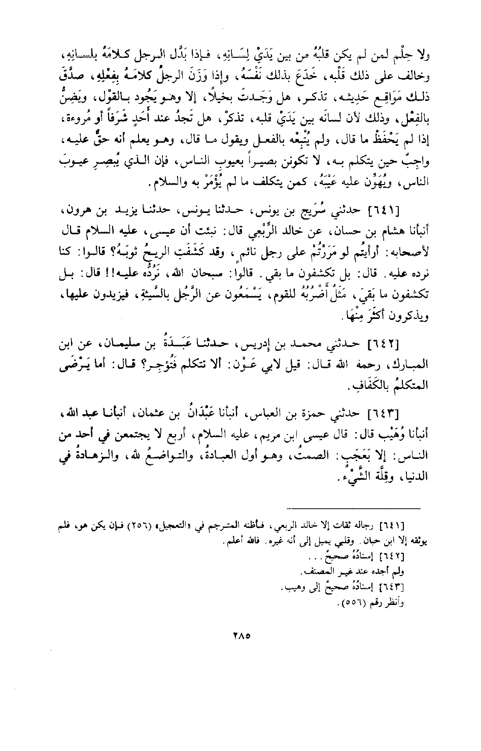 643 - حَدَّثَنِي حَمْزَةُ بْنُ الْعَبَّاسِ، أَخْبَرَنَا عَبْدَانُ بْنُ عُثْمَانَ، أَخْبَرَنَا عَبْدُ اللَّهِ، أَخْبَرَنَا وُهَيْبٌ قَالَ: " §قَالَ عِيسَى ابْنُ مَرْيَمَ عَلَيْهِ السَّلَامُ: أَرْبَعٌ لَا يَجْتَمِعْنَ فِي أَحَدٍ مِنَ النَّاسِ إِلَّا بِعُجْبٍ: الصَّمْتُ وَهُوَ أَوَّلُ الْعِبَادَةِ، وَالتَّوَاضُعُ لِلَّهِ، وَالزَّهَادَةُ فِي الدُّنْيَا، وَقِلَّةُ الشَّيْءِ "