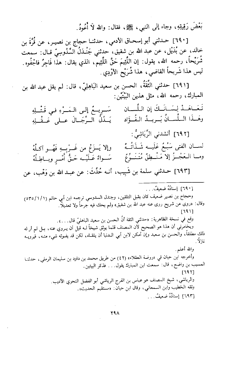 691 - حَدَّثَنِي الثِّقَةُ الْحَسَنُ بْنُ سَعِيدٍ الْبَاهِلِيُّ قَالَ: لَمْ يَقُلْ عَبْدُ اللَّهِ بْنُ الْمُبَارَكِ رَحِمَهُ اللَّهُ مِثْلَ هَذَيْنِ الْبَيْتَيْنِ: «§تَعَاهَدْ لِسَانَكَ إِنَّ اللِّسَانَ سَرِيعٌ إِلَى الْمَرْءِ فِي قَتْلِهِ