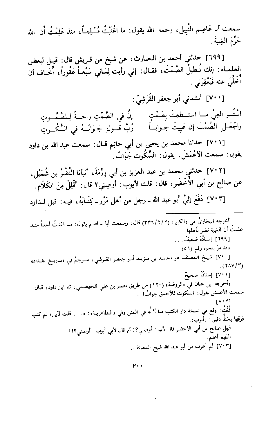 701 - حَدَّثَنَا مُحَمَّدُ بْنُ يَحْيَى بْنِ أَبِي حَاتِمٍ، قَالَ: سَمِعْتُ عَبْدَ اللَّهِ بْنَ دَاوُدَ يَقُولُ: سَمِعْتُ الْأَعْمَشَ يَقُولُ: «§السُّكُوتُ جَوَّابٌ»