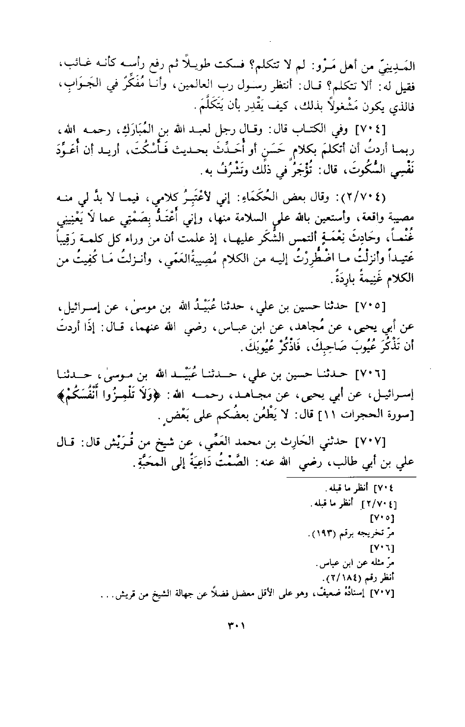 704 - وَفِي الْكِتَابِ قَالَ: وَقَالَ رَجُلٌ لِعَبْدِ اللَّهِ بْنِ الْمُبَارَكِ رَحِمَهُ اللَّهُ: رُبَّمَا أَرَدْتُ أَنْ أَتَكَلَّمَ بِكَلَامٍ حَسَنٍ أَوْ أُحَدِّثُ بِحَدِيثٍ فَأَسْكَتُ، أُرِيدُ أَنْ أُعَوِّدَ نَفْسِي السُّكُوتَ، قَالَ: «§تُؤْجَرُ فِي ذَلِكَ وَتَشْرُفُ بِهِ»