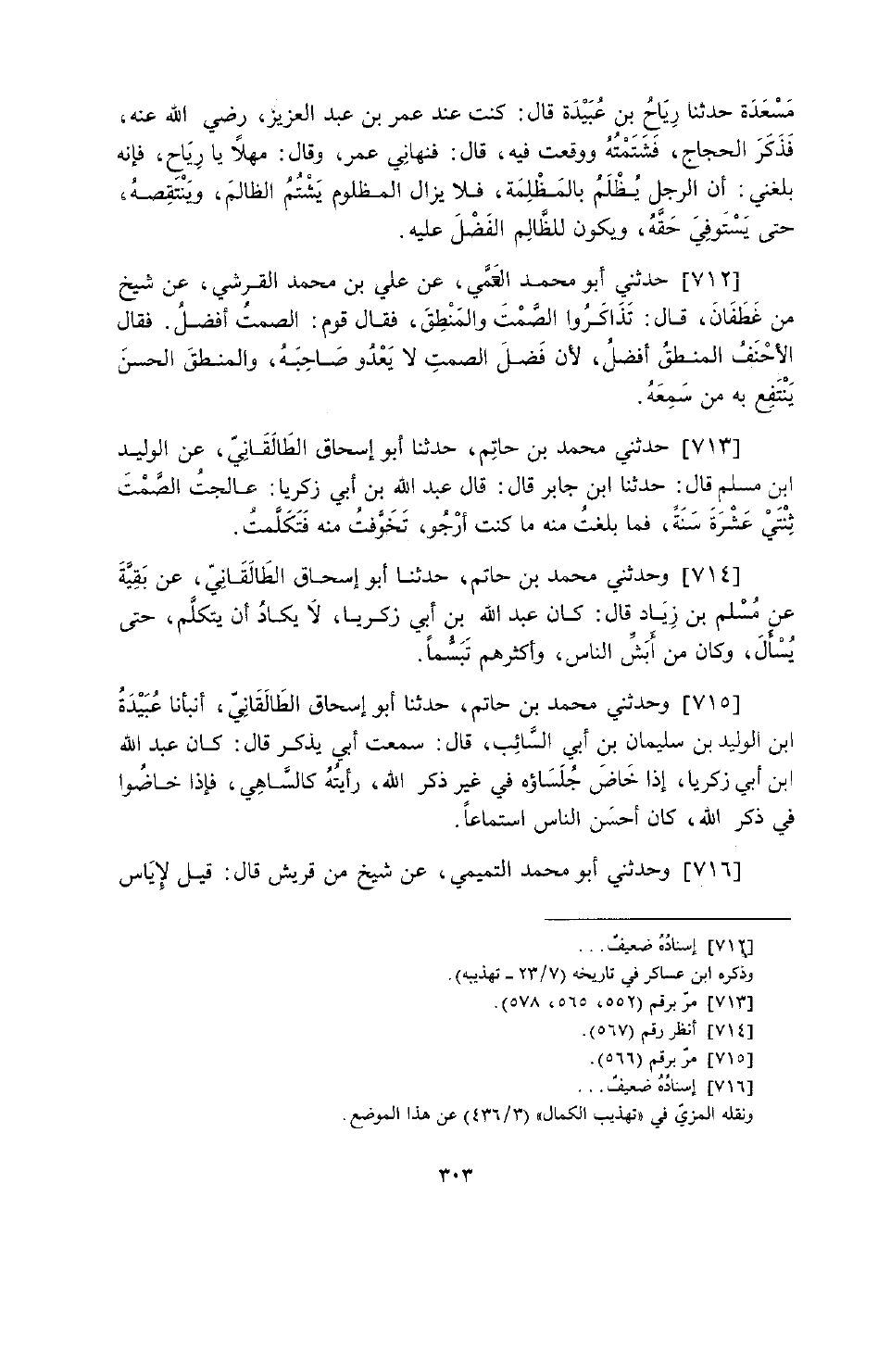 713 - حَدَّثَنِي مُحَمَّدُ بْنُ حَاتِمٍ، حَدَّثَنَا أَبُو إِسْحَاقَ الطَّالْقَانِيُّ، عَنِ الْوَلِيدِ بْنِ مُسْلِمٍ، قَالَ: حَدَّثَنَا ابْنُ جَابِرٍ، قَالَ: قَالَ عَبْدُ اللَّهِ بْنُ أَبِي زَكَرِيَّا: «§عَالَجْتُ الصَّمْتَ ثِنْتَيْ عَشْرَةَ سَنَةً، فَمَا بَلَغْتُ مِنْهُ مَا كُنْتُ أَرْجُو، تَخَوَّفْتُ مِنْهُ فَتَكَلَّمْتُ»